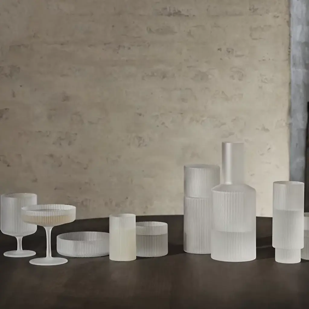 The Ripple Verrines - Set of 4 from Ferm Living pays homage to French culinary tradition while introducing innovative design elements. Each mouth-blown glass in this set of four exhibits precise vertical ridges that wrap around the surface, referencing classical French serving vessels while introducing a modern perspective. These versatile glasses excel at presenting both appetizers and desserts. Their thoughtful design allows them to double as lids for the Ripple Carafe, demonstrating smart multi-functionality.