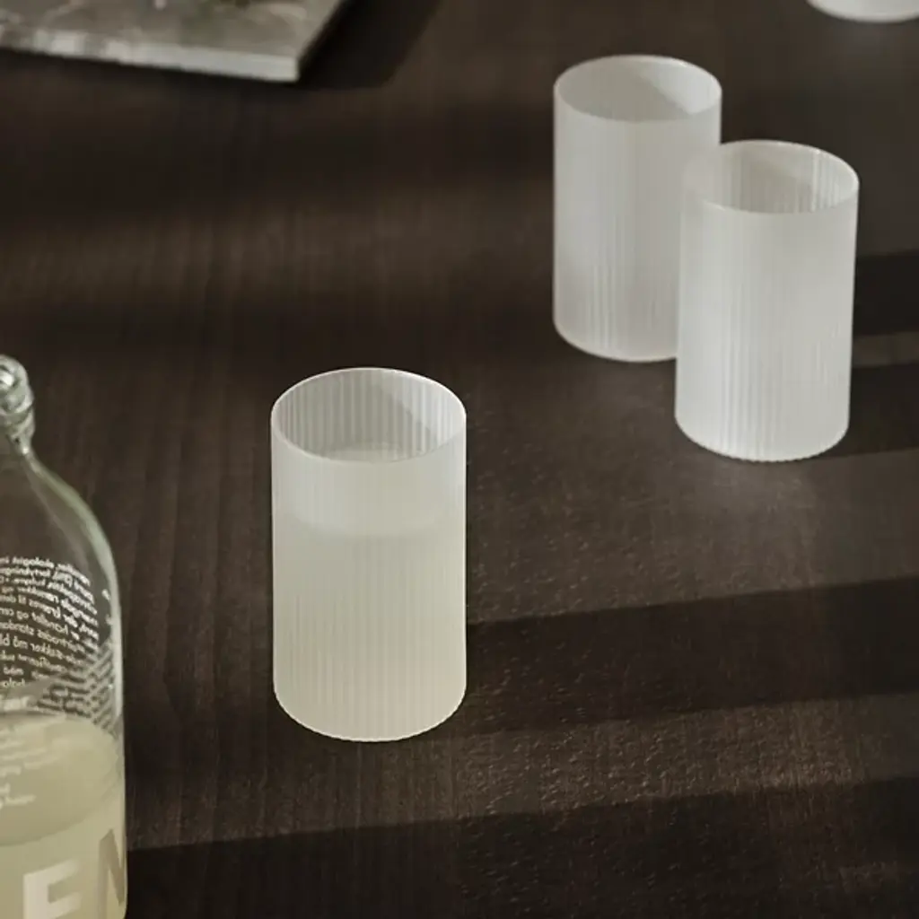 The Ripple Verrines - Set of 4 from Ferm Living pays homage to French culinary tradition while introducing innovative design elements. Each mouth-blown glass in this set of four exhibits precise vertical ridges that wrap around the surface, referencing classical French serving vessels while introducing a modern perspective. These versatile glasses excel at presenting both appetizers and desserts. Their thoughtful design allows them to double as lids for the Ripple Carafe, demonstrating smart multi-functionality.