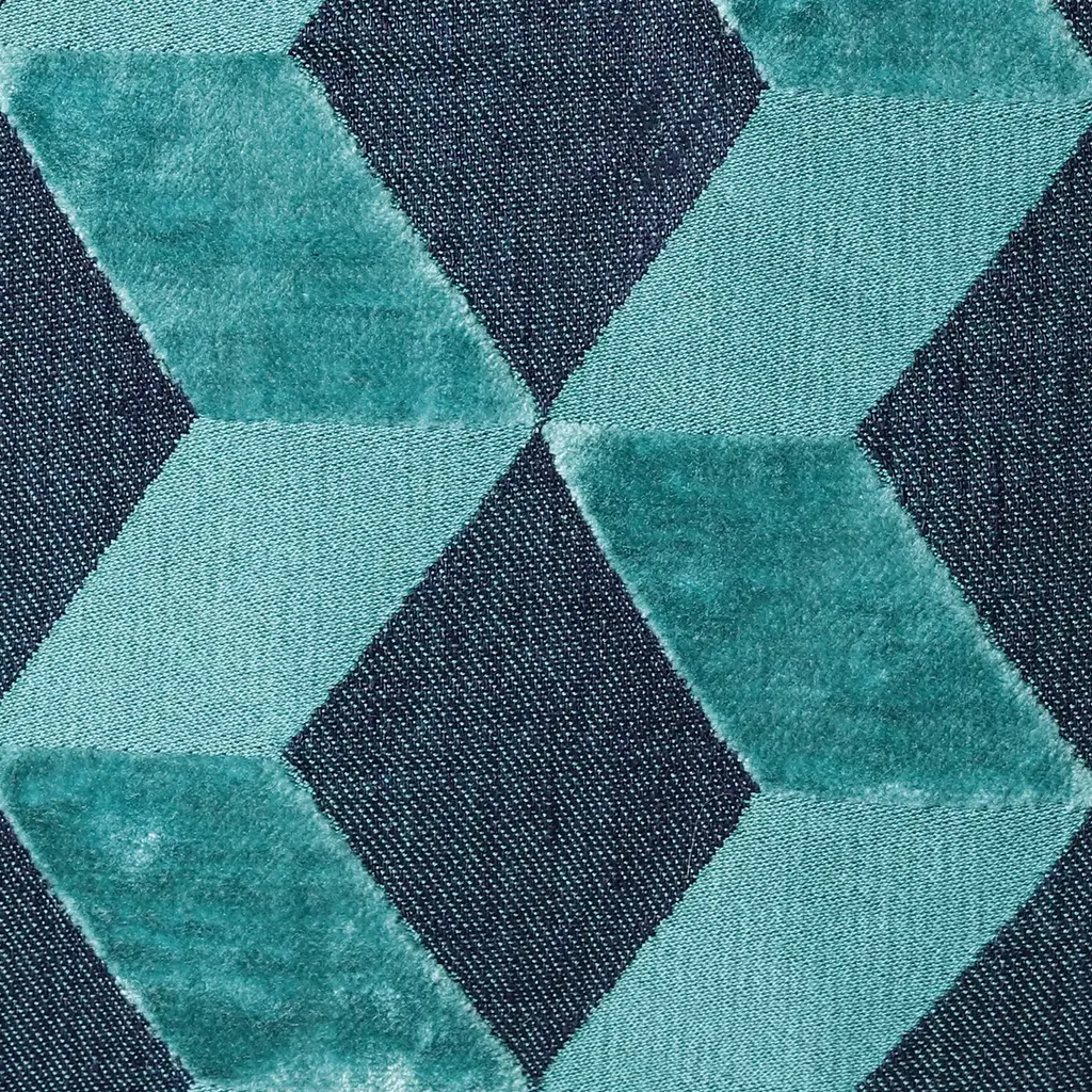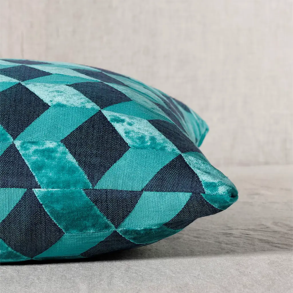 The Rischio cushion is a mosaic of jacquard in cotton, linen, and viscose, a harmonic connection between fabric and ceramic. The turquoise color is reminiscent of the semiprecious gem that decorated the floors of majestic Ottoman baths.