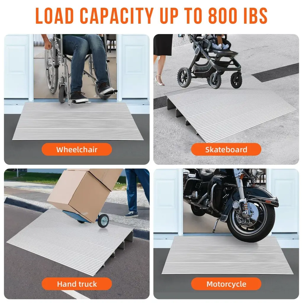 Secure Entry Solution: Our rise doorway ramp is specifically designed to provide a safe and smooth transition over thresholds, making it ideal for individuals with mobility challenges. It ensures efficient access, guaranteeing users can navigate doorways with ease. Durable Aluminum Build: Constructed entirely from high-quality aluminum, this door ramp is built to withstand the test of time. Its anodized finish makes it rust-proof and scratch-resistant, ensuring that it remains functional and aesthetically pleasing in both indoor and outdoor settings. Impressive Load Capacity: This robust threshold ramp is engineered to support up to 800 lbs, making it suitable for a wide range of mobility aids, including wheelchairs, scooters, and walkers. Its stable 7.87-inch wide leading edge provides reassurance and stability for users and caregivers. Non-Slip Safety Features: Prioritizing user safety, our ramp includes a non-slip surface that ensures secure passage in any weather condition. This feature enhances mobility for users of wheelchairs, strollers, or scooters, promoting greater independence and confidence during use. Easy Installation & Versatile Use: With a design that's both adjustable and easy to install, this ramp serves as a practical addition to any doorway. It caters to various mobility aids, making it a versatile solution that seamlessly adapts to the diverse needs of users, ensuring greater accessibility in daily life.