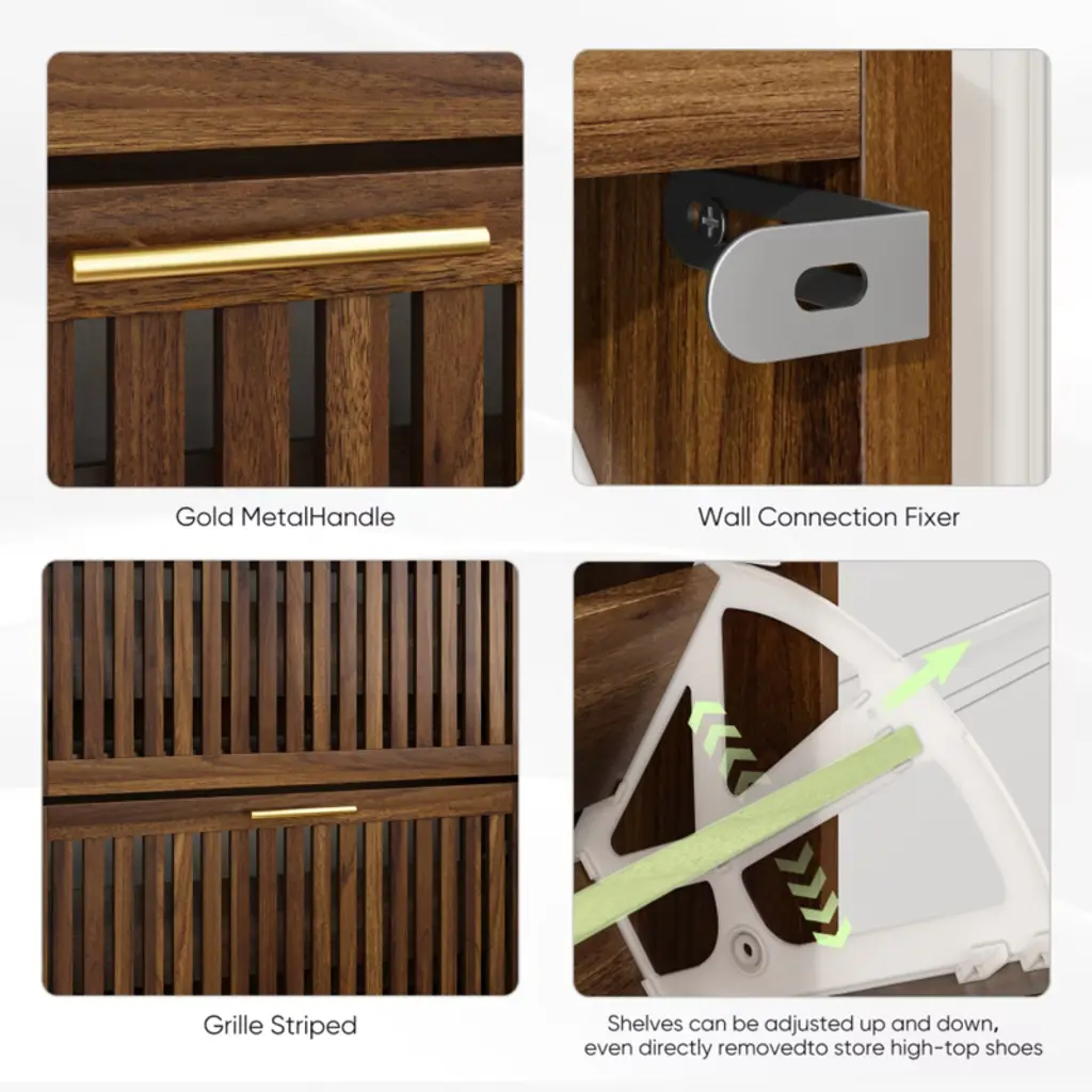 The 31.5-inch Walnut Shoe Storage Cabinet—a perfect fusion of style and practicality. Designed for modern households, this medieval modern-inspired cabinet combines a sleek walnut finish with functional details like gold handles and a wavy groove panel, adding visual intrigue to corridors, entrances, or small apartments.Adjustable the flip drawers’ partitions to fit everything from bulky boots to delicate flats, while the open bottom rack offers quick access to frequently worn shoes.The flat top keeps keys, mail, or decorative items within reach yet neatly organized.Built to last with sturdy MDF and solid wood legs, this cabinet balances durability with lightweight portability. Its slim profile saves space without compromising on storage, making it a must-have for urban dwellers, minimalist enthusiasts, or anyone seeking a stylish solution to shoe chaos. Transform your doorway into a tidy, inviting space—effortlessly.