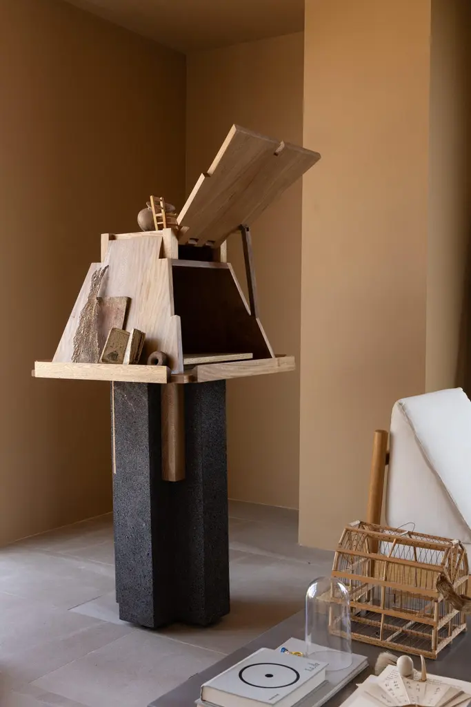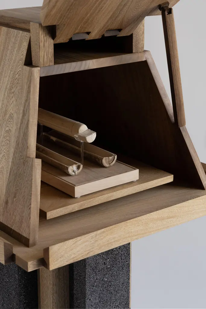 Rito is inspired by the lectern, one of the most representative pieces of ecclesiastical furniture from churches of the 15th century. These finely decorated stands were used to hold choral scores, but after the invention of the printing press and the subsequent reproduction of individual books, the use of lecterns declined. In the 1940s, the Mexican architect Luis Barragán revisited the idea of the lectern, treating it as animportant element of his home and studio in Mexico City. Rito bears a similarly intimate inspiration, seeking to generate a dialogue between the private and the sacred. Its volcanic stone base and wooden pyramid-shaped body refer to volcanoes and pre-Hispanic Mexican constructions. The four sides of the piece invite you to place images on them and create your own visual sanctuaries of personal iconography. Rito was created using traditional carpentry techniques, giving way to unique interior spaces. When you open one of its sides, you’ll reveal an altar-like base, where you can store precious objects. The interplay between heavy stone and lightweight wood, as well as between shapes, give Rito sculptural and architectural qualities. Rito fuses pre-Hispanic heritage and the sacredness of the intimate sphere of the home in a contemplative object that solemnly transforms a space.
