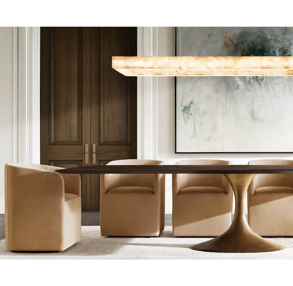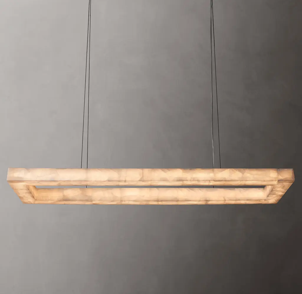 Minimalist in form, dramatic in effect, our Rivage chandelier by Timothy Oulton celebrates the beauty of calcite, a translucent stone with a warm, natural glow. Suspended from slender steel cables, a halo of polished stone is expertly pieced to create a smooth, continuous surface, while subtle illumination from within highlights the organic coloration and veining. Each fixture is a one-of-a-kind statement. SHOP THE ENTIRE COLLECTION