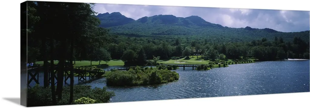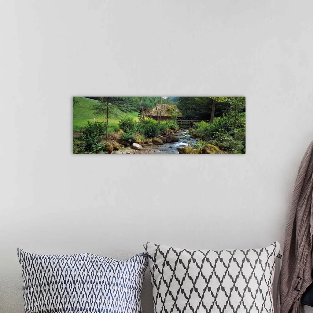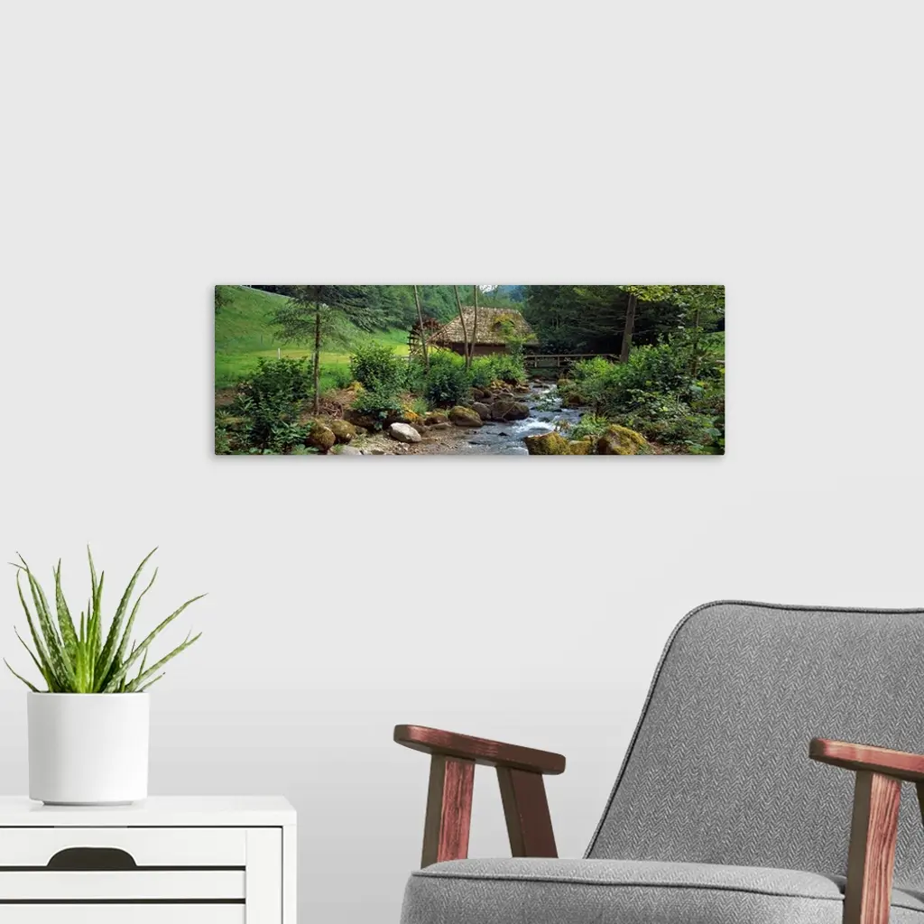Panoramic wall art of a bucolic scene in this photograph a river filled with moss covered boulders runs through a meadow with a rustic waterwheel built next to it.