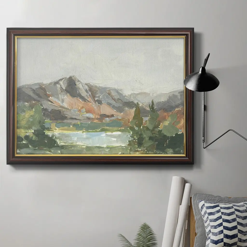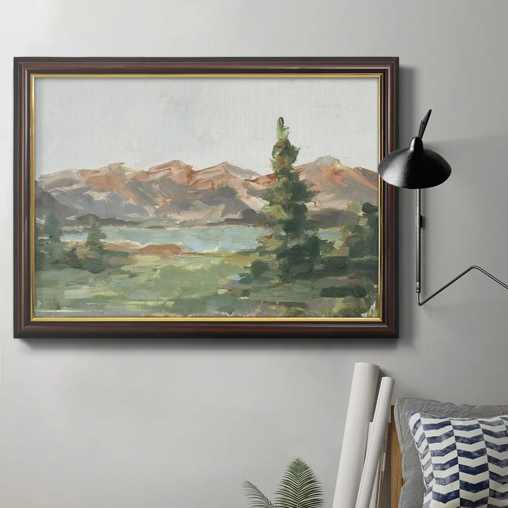 A placid river meanders among rocks and towering evergreens in this gorgeous wall art. The dark brown and copper frame complements this serene landscape that captures the majestic silhouette of distant mountains against the sky.