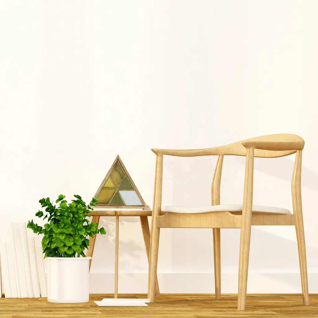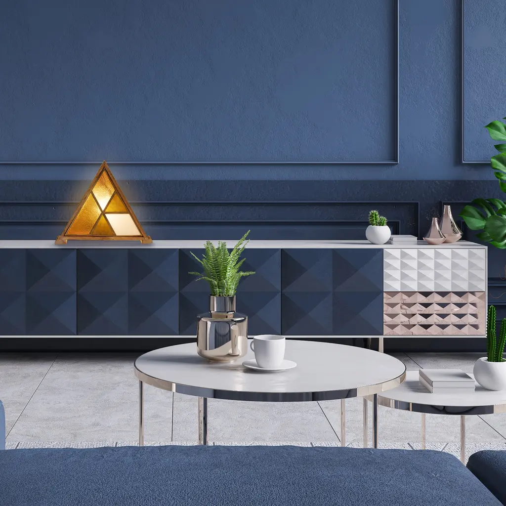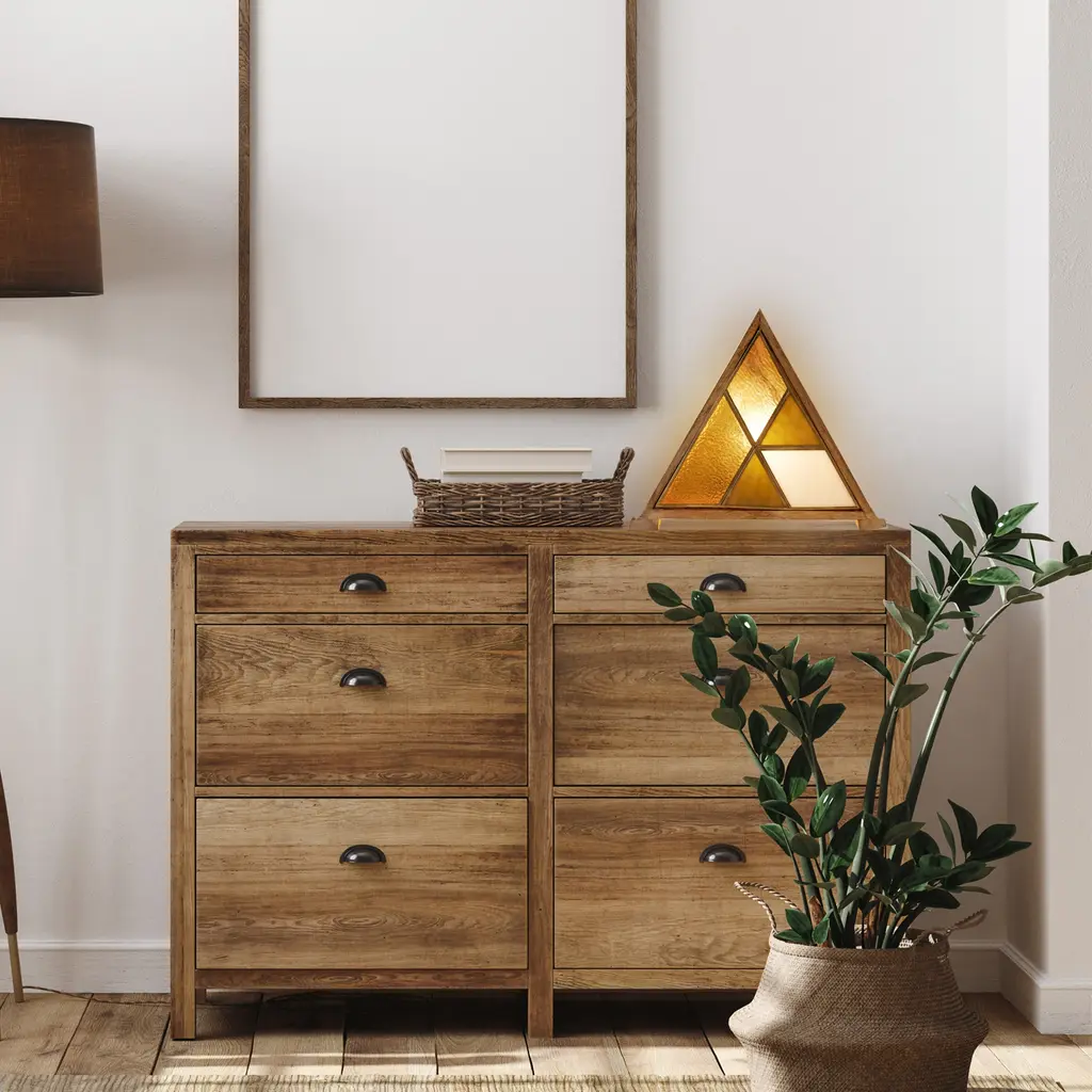 Illuminate your space with a touch of modern style. This unique accent lamp features a wood-framed triangle base supporting a geometric stained glass design. The lamp's textured amber, striated green, and opaque white glass panes create an engaging pattern that adds character to any room. Its on-off line switch ensures simple operation, while the 93-inch long cord gives you flexibility in positioning the lamp. The lamp uses one Type C 40-watt bulb (not included) which is compatible with incandescent, CFL, and LED types.