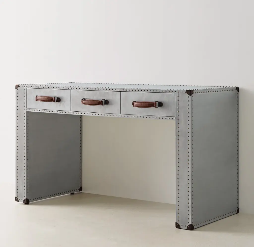 Inspired by a vintage travel trunk, our industrial collection is clad in Brushed Aluminum secured with rows of raised rivets. Bronze corner brackets and warm leather pulls add the finishing touch to each piece.