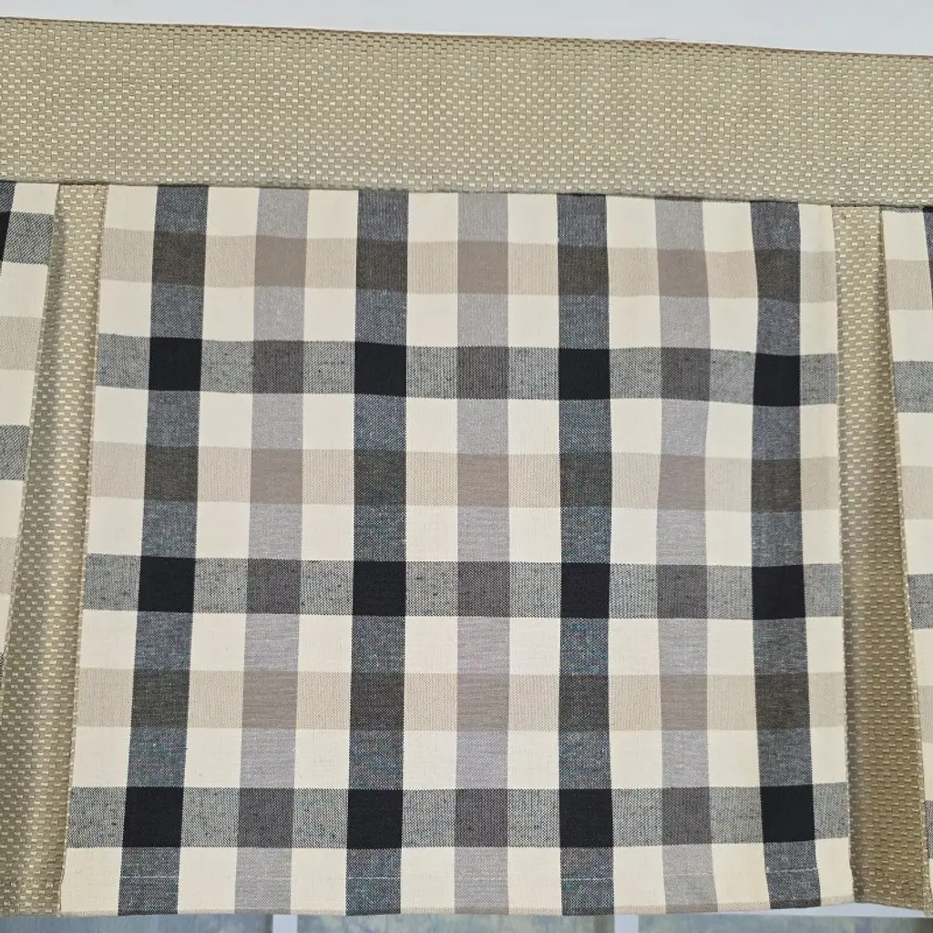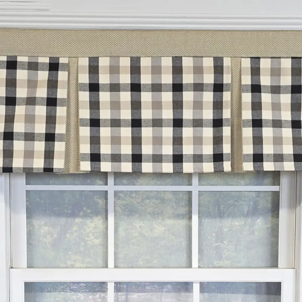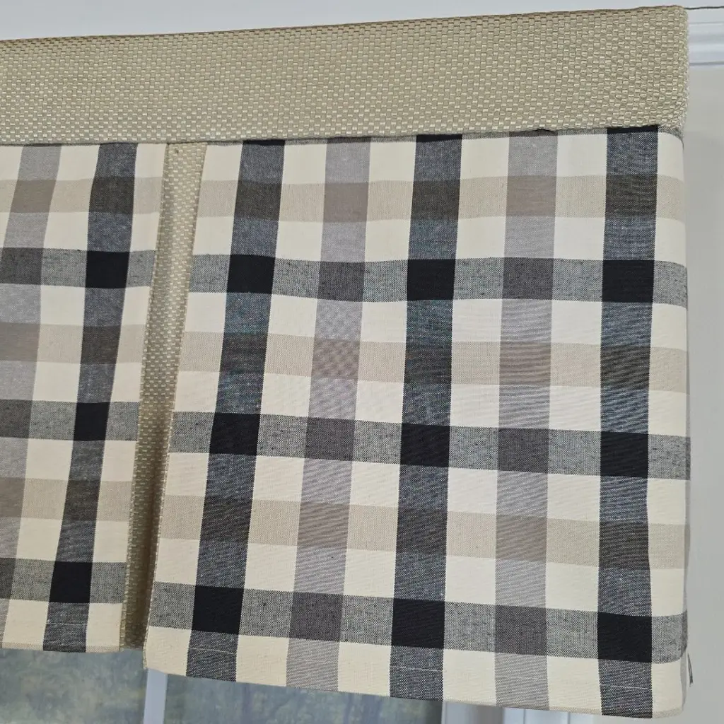 Introduce rustic refinement with the RLF Home Bison Check Pleated valance made from rich 100% cotton decorator-quality fabric. Sized 50" wide and 17" Long, this unlined black valance fits windows up to 48" wide and features neatly stitched pleats complemented by a contrasting basket weave fabric along the bottom for added texture and dimension. Its unlined construction allows light to softly illuminate your room while preserving a classic fabric aesthetic. Designed to slide easily onto continental, standard curtain, tension, or decorative rods, this valance installs quickly to deliver a bespoke designer finish. Use multiples to cover wider areas. Spot clean only to retain its crisp tailored appearance. With fast delivery, artisanal pattern work, and excellent craftsmanship, this valance delivers long-lasting beauty and cozy charm — perfect for kitchens, cabins, bedrooms, or farmhouse-inspired interiors.
