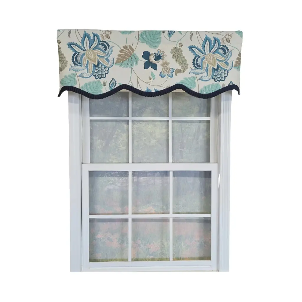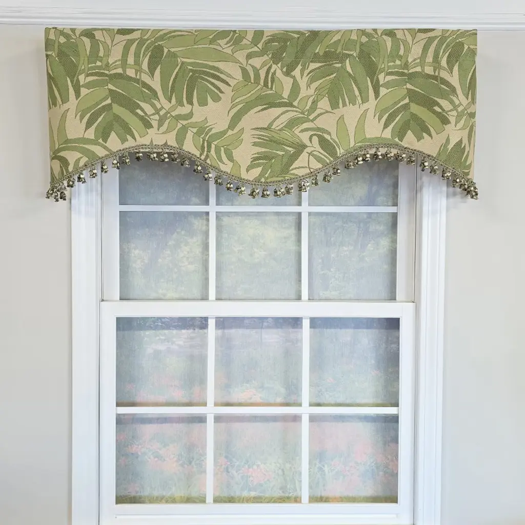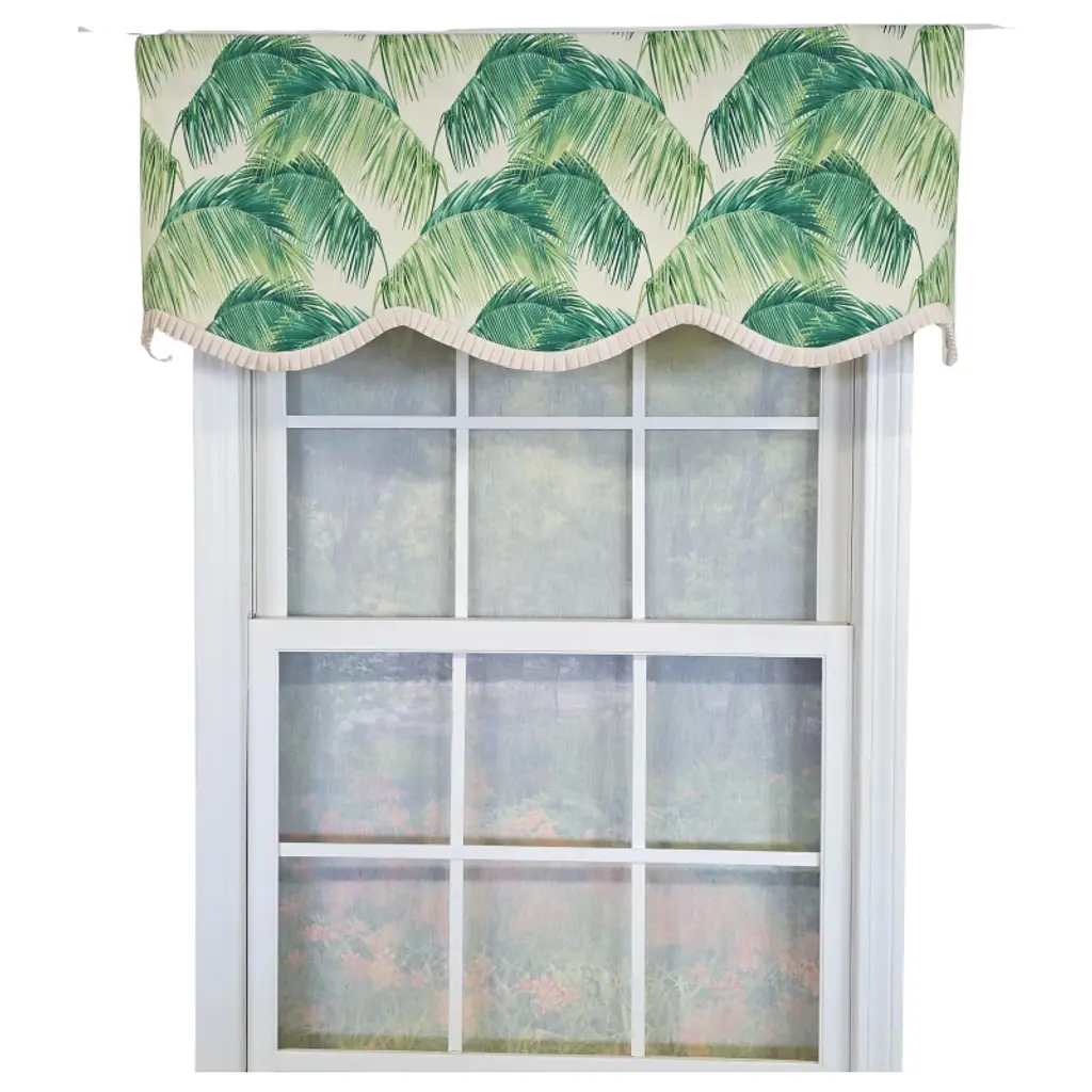 The Breeze Cornice Valance by RLF Home adds a finished look to windows with a tailored design and tassel trim detail. Made in the USA from 100% cotton with a poly/cotton ivory lining, this valance measures 50 inches wide by 17 inches long. It fits windows up to 48 inches wide and can be used in multiples for larger spans. The bottom edge features coordinating multicolor tassel trim for added texture. Designed for use with a 2-1/2 inch continental rod, standard 3/4 inch curtain rod, tension rod, or decorative pole. Spot clean only.