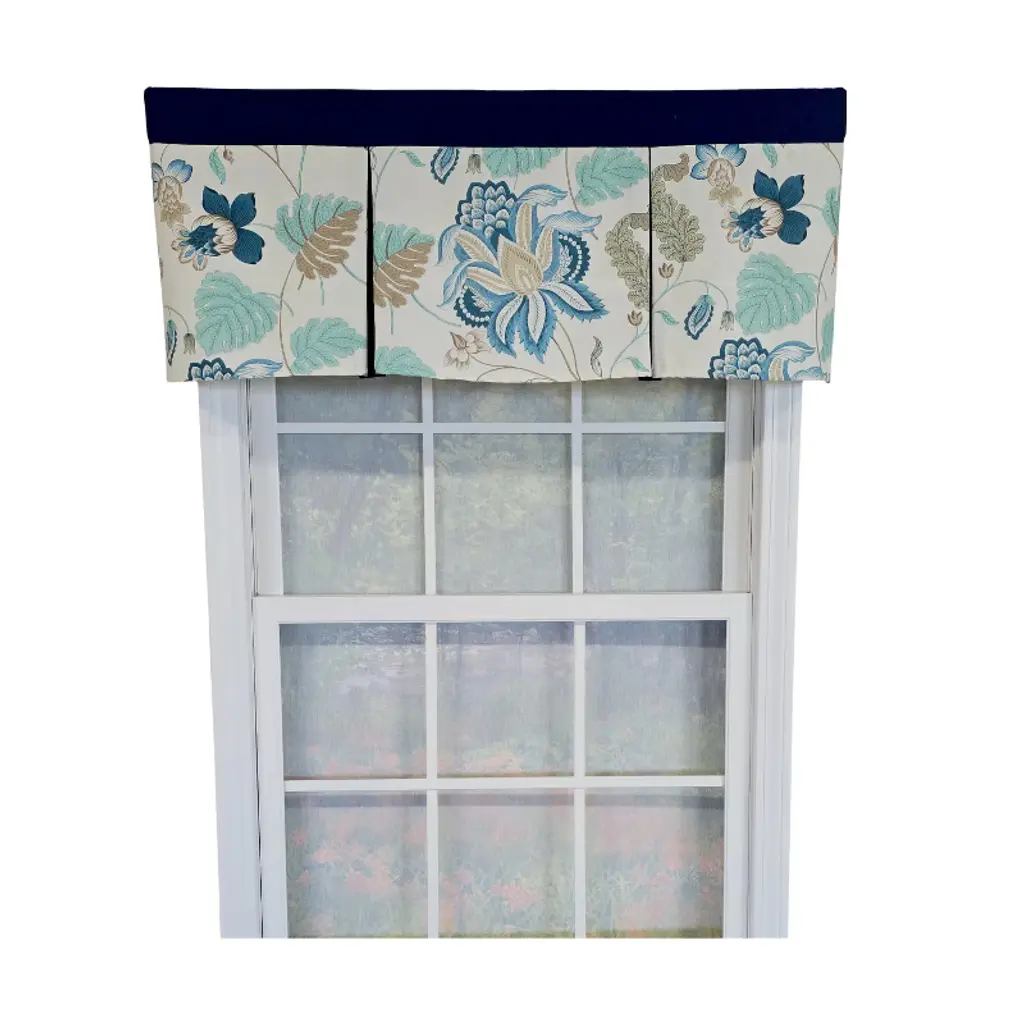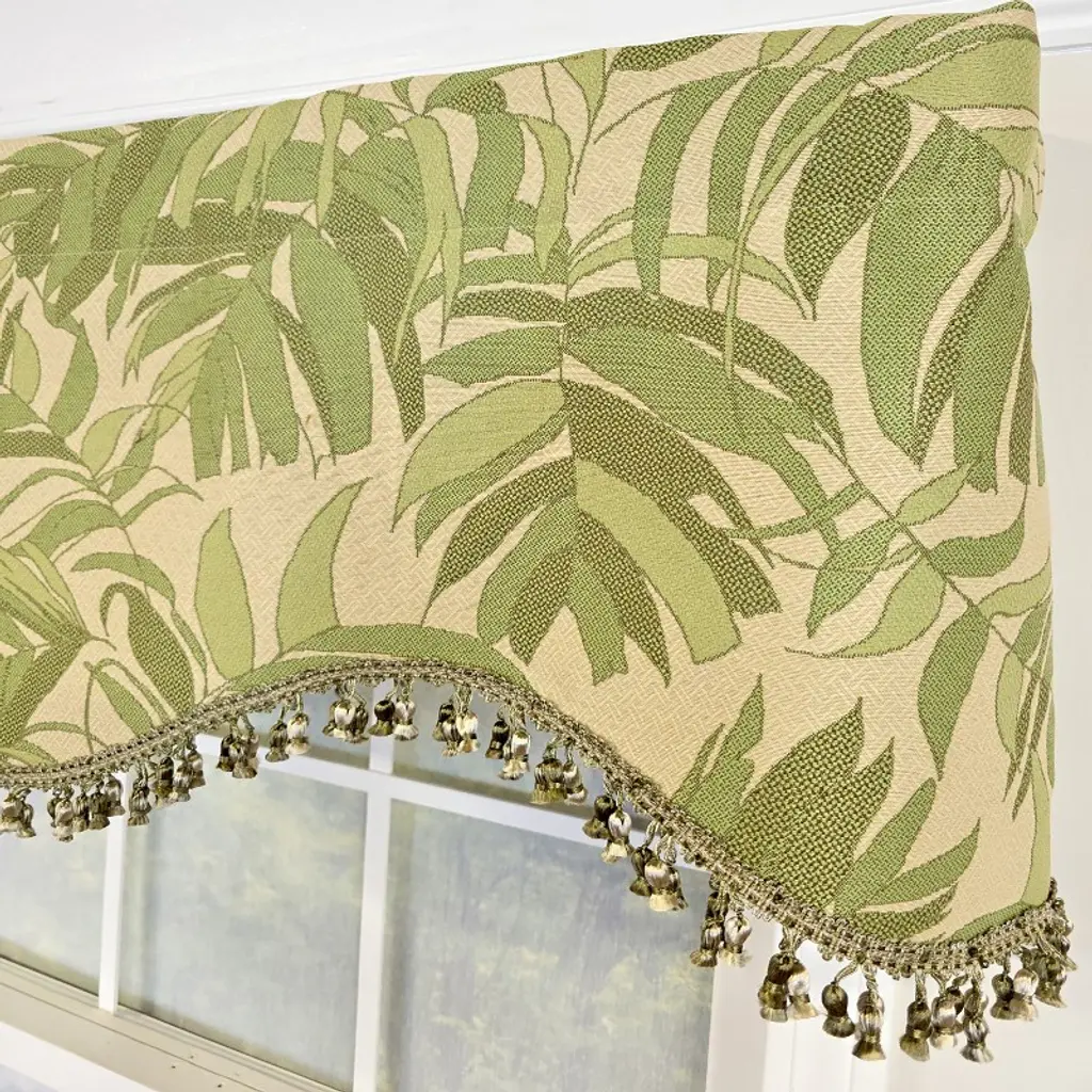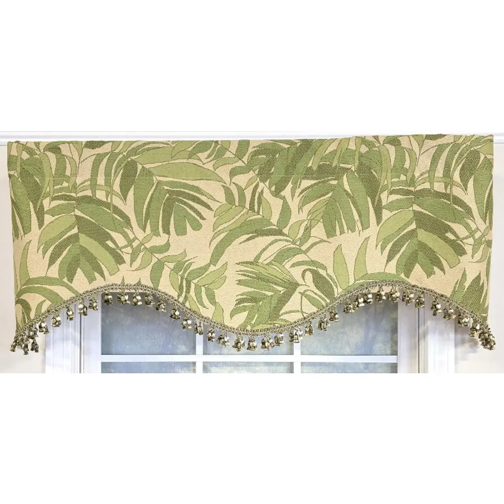 The Breeze Cornice Valance by RLF Home adds a finished look to windows with a tailored design and tassel trim detail. Made in the USA from 100% cotton with a poly/cotton ivory lining, this valance measures 50 inches wide by 17 inches long. It fits windows up to 48 inches wide and can be used in multiples for larger spans. The bottom edge features coordinating multicolor tassel trim for added texture. Designed for use with a 2-1/2 inch continental rod, standard 3/4 inch curtain rod, tension rod, or decorative pole. Spot clean only.