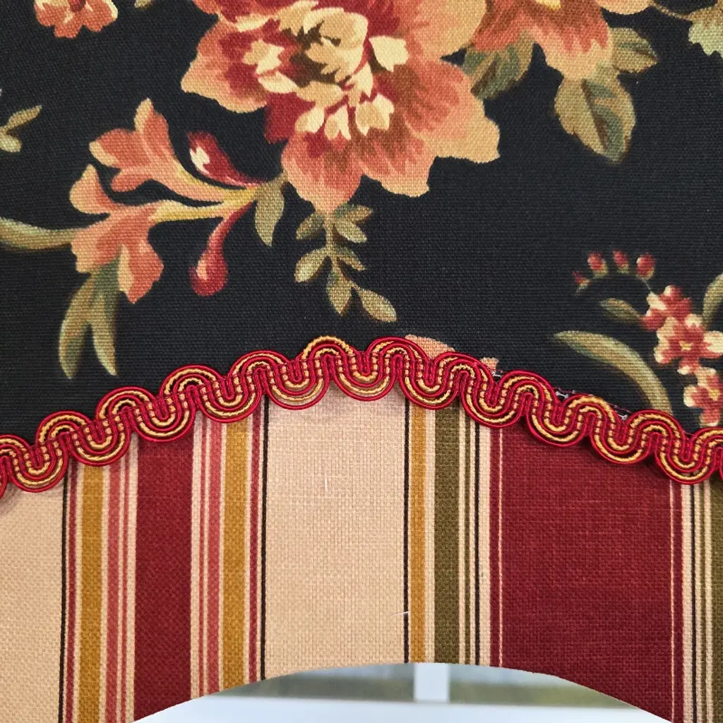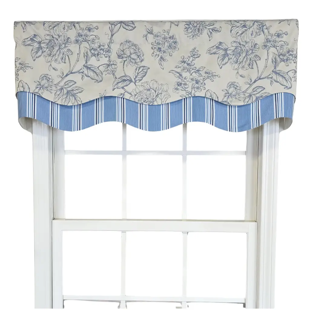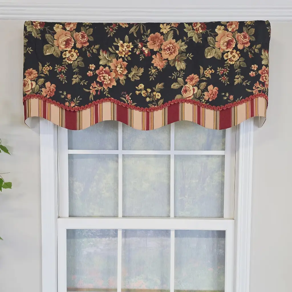 Make a bold yet timeless statement with the RLF Home Lancaster Glory Cornice Valance in black. Crafted from 100% cotton and fully lined with a durable poly/cotton ivory blend, this 50" wide and 16" Long-inch valance adds refined sophistication to any room. Perfect for windows up to 48 inches wide, it can be used in multiples for wider spans. The design features a coordinating striped bottom layer and a braided gimp trim, adding depth and texture for a dramatic, tailored look. Ideal for traditional, colonial, or vintage-inspired spaces, this valance is proudly made in the USA from a mix of domestic and imported fabrics, showcasing RLF's commitment to quality. Installation is quick and easy with a 2-1/2" continental rod, standard 3/4" curtain rod, tension rod, or decorative pole. Spot clean only to preserve its crisp, classic lines. Bring heritage-inspired elegance and superior craftsmanship to your window décor.