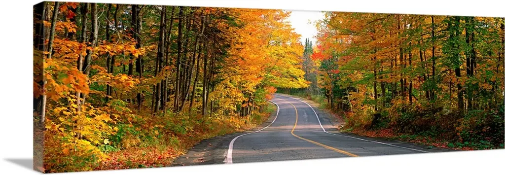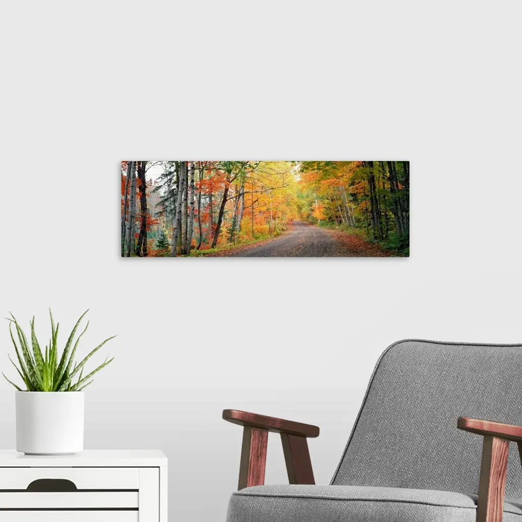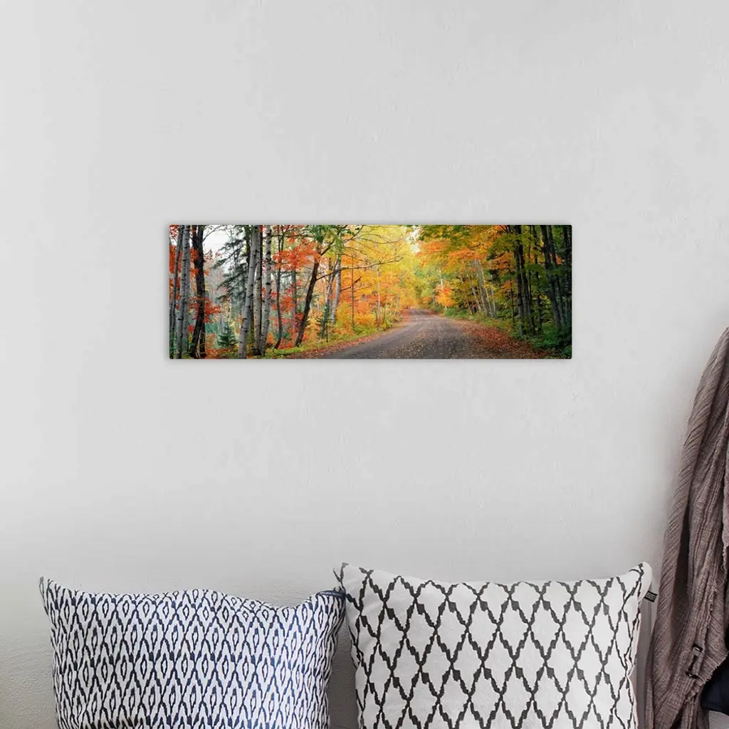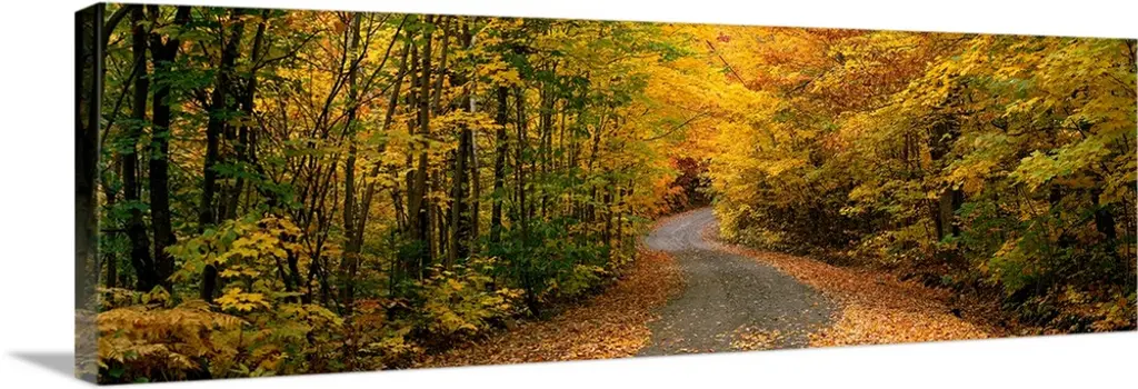 Panoramic photograph taken of a street littered with the scattered leaves of the surrounding woodlands. The colors of the trees clearly signal the Fall season.