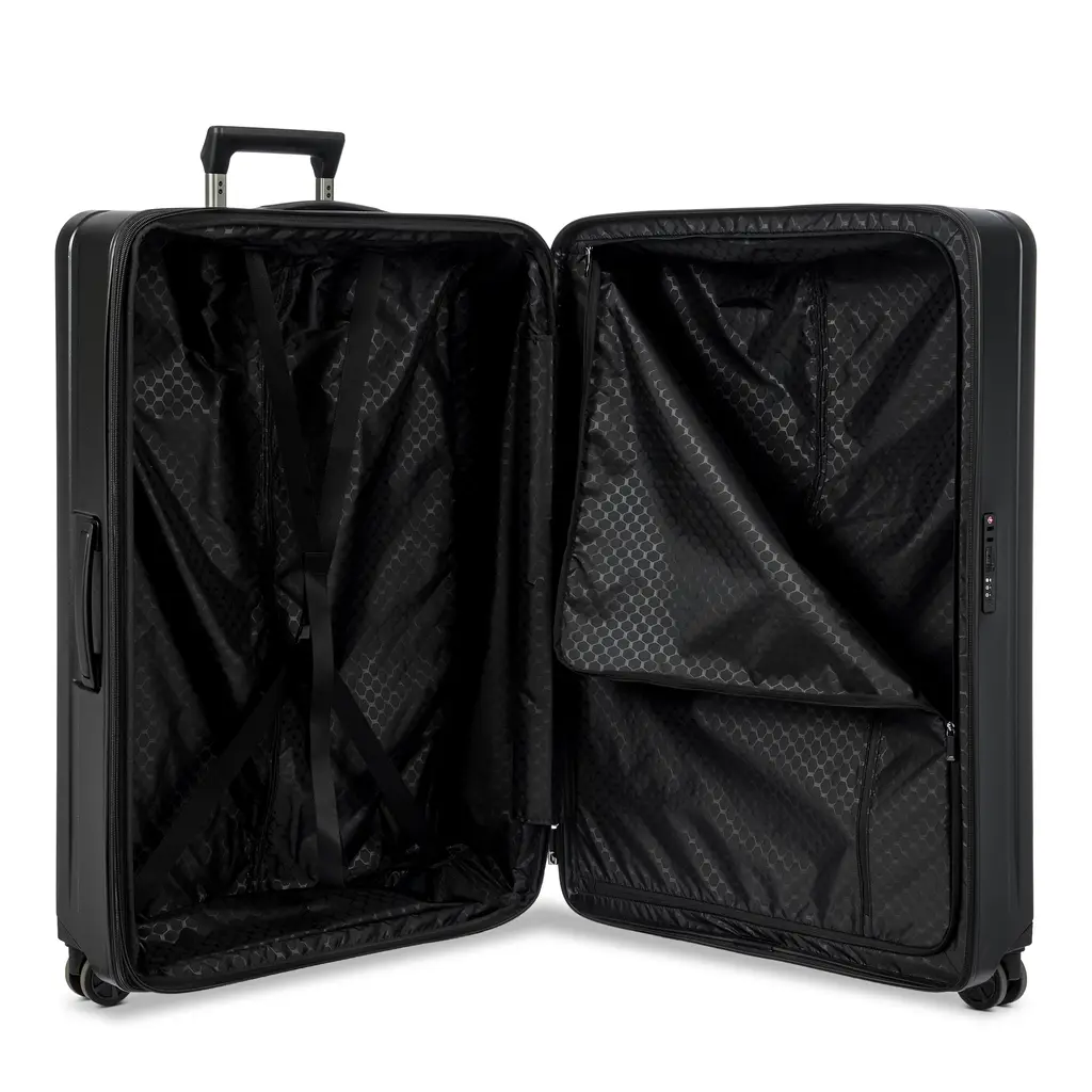 Ultra-light and inspired by the colors of the Porsche cars: the Roadster Hardcase collection. The polycarbonate luggage series developed by the Studio F.A. Porsche is the perfect fusion of form, function and design. The spacious Porsche Design Roadster Hardcase amazes with lightweight and its dynamic monochrome look with Porsche Signature details. Ball bearing, smooth-rolling wheels and a multi-step, ergonomic handle provide for the perfect performance. Through the rounded edges of the handle, bags can be easily attached and removed. The divided interior is also flexible - and can be expanded at any time. An ultra-secure two-way zipper and a TSA lock protect your luggage. The Roadster Hardcase Collection introduces a new level of lightweight, combined with a bold new design. When it comes to travel, lightness and capacity are essential. The front pattern and the wheels are inspired by the Porsche classic design: indicating performance and vigor. Crafted from Polycarbonate, the collection combines flexibility and durability, offering two distinct finishes: matte or glossy, in colors inspired by the automotive world. The design is accentuated by the Porsche Design logo, while the interior features a Porsche Design hexagon pattern. This collection takes the commitment of high performance to an entirely new level.