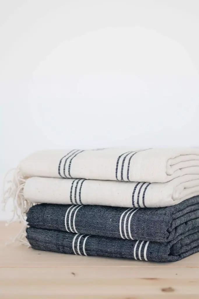 Handwoven in Ethiopia using time-honored weaving traditions and AZO-free dyes. All of the dyeing is done in small batches at the workshop as the artisans work to rekindle the tradition of natural dye in Ethiopia. These towels are perfect in the bathroom and kitchen. Absorbent and quick drying cotton.Roan Iris works with artisans around the globe to bring their craft and age-old techniques into the modern marketplace. This work brings fair wages and ethical working conditions into rural communities where employment opportunity is minimal.* Handwoven with 100% cotton * Machine wash cool, dry on low* Sold individually* Imported#### *Dimensions** Large: approximately 37" wide, 72" longPlease note handmade products will have slight variations, this is a natural occurrence in handcrafted goods.