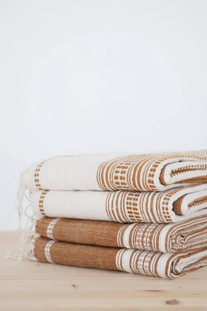 Handwoven in Ethiopia using time-honored weaving traditions and AZO-free dyes. All of the dyeing is done in small batches at the workshop as the artisans work to rekindle the tradition of natural dye in Ethiopia. These towels are perfect in the bathroom and kitchen. Absorbent and quick drying cotton.Roan Iris works with artisans around the globe to bring their craft and age-old techniques into the modern marketplace. This work brings fair wages and ethical working conditions into rural communities where employment opportunity is minimal.* Handwoven with 100% cotton * Machine wash cool, dry on low* Sold individually* Imported#### *Dimensions** Large: approximately 37" wide, 72" longPlease note handmade products will have slight variations, this is a natural occurrence in handcrafted goods.