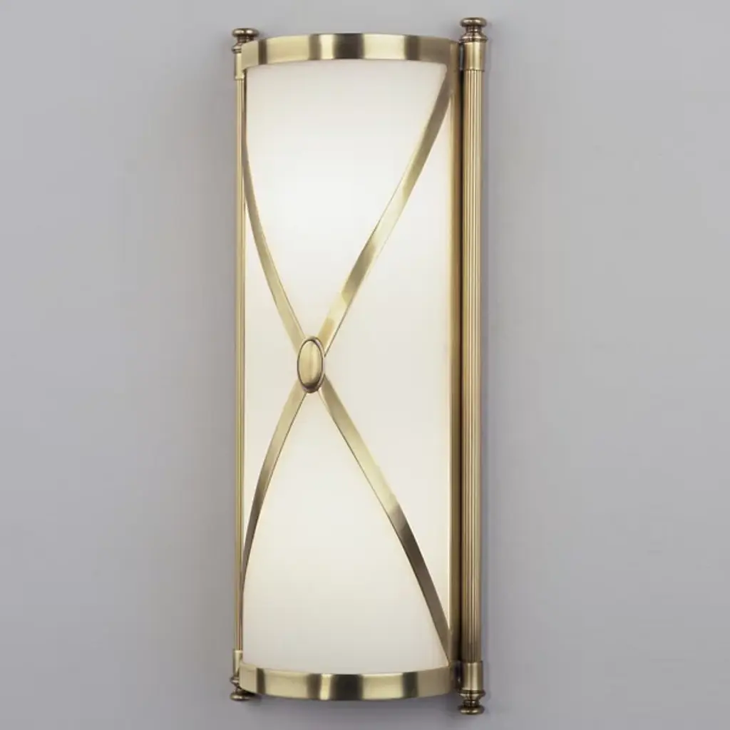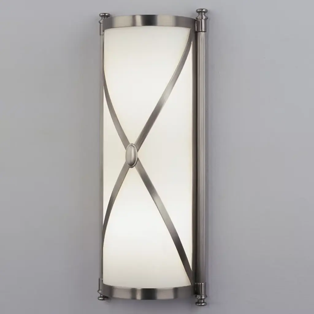 The elegant crisscross metal pattern on the framing of Chase hardwire suggests a delicate piece of jewelry to light any environment. Accented with center button detail, the wall sconces are hinged for easy bulb replacement. Available in four fine finishes; polished nickel, dark antique nickel, antique brass, and deep patina bronze. Wall sconces may be mounted horizontally or vertically and are available in three sizes: 16.5", 25.5" and 37". Features Includes a frosted white cased glass shade (2) 40 watt medium (E26) bulbs required Can be mounted horizontally or vertically UL rated for damp locations Compliant with ADA standards Dimensions Height: 16-1/2" Width: 6-1/2" Extension: 3-3/4" Product Weight: 6 lbs Shade Height: 16-1/2" Shade Width: 5-1/4" Backplate Height: 16-3/8" Backplate Width: 6-1/2" Electrical Specifications Max Wattage: 80 watts Number of Bulbs: 2 Max Watts Per Bulb: 40 watts Bulb Base: Medium (E26) Voltage: 110 volts Bulbs Included: No