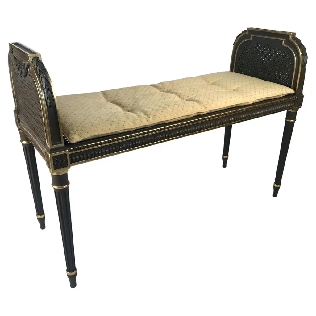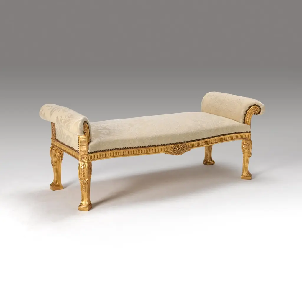 A fine carved giltwood window seat after a design byRobert Adam. Upholstered in client’s own material.Bespoke sizing, design adaptations and finishing available.We are currently working to a 30-36 week lead time.