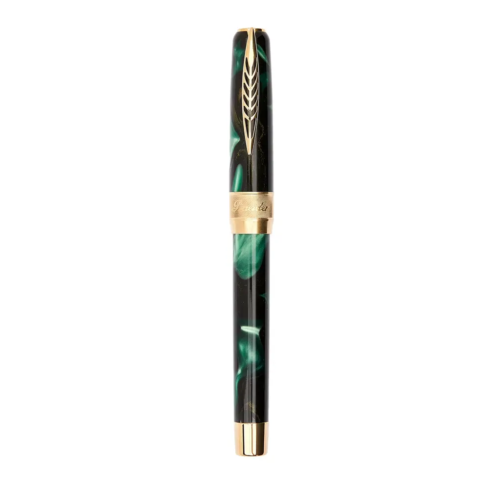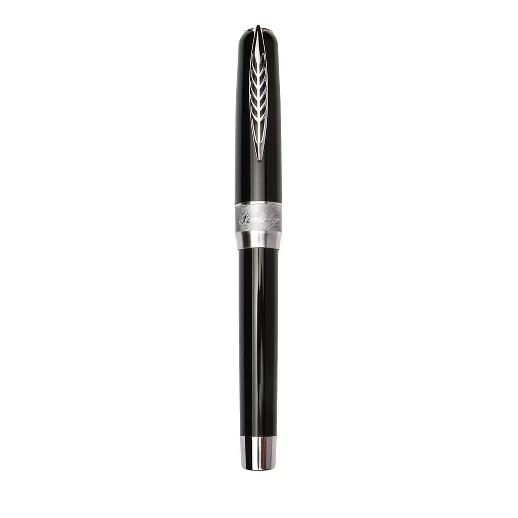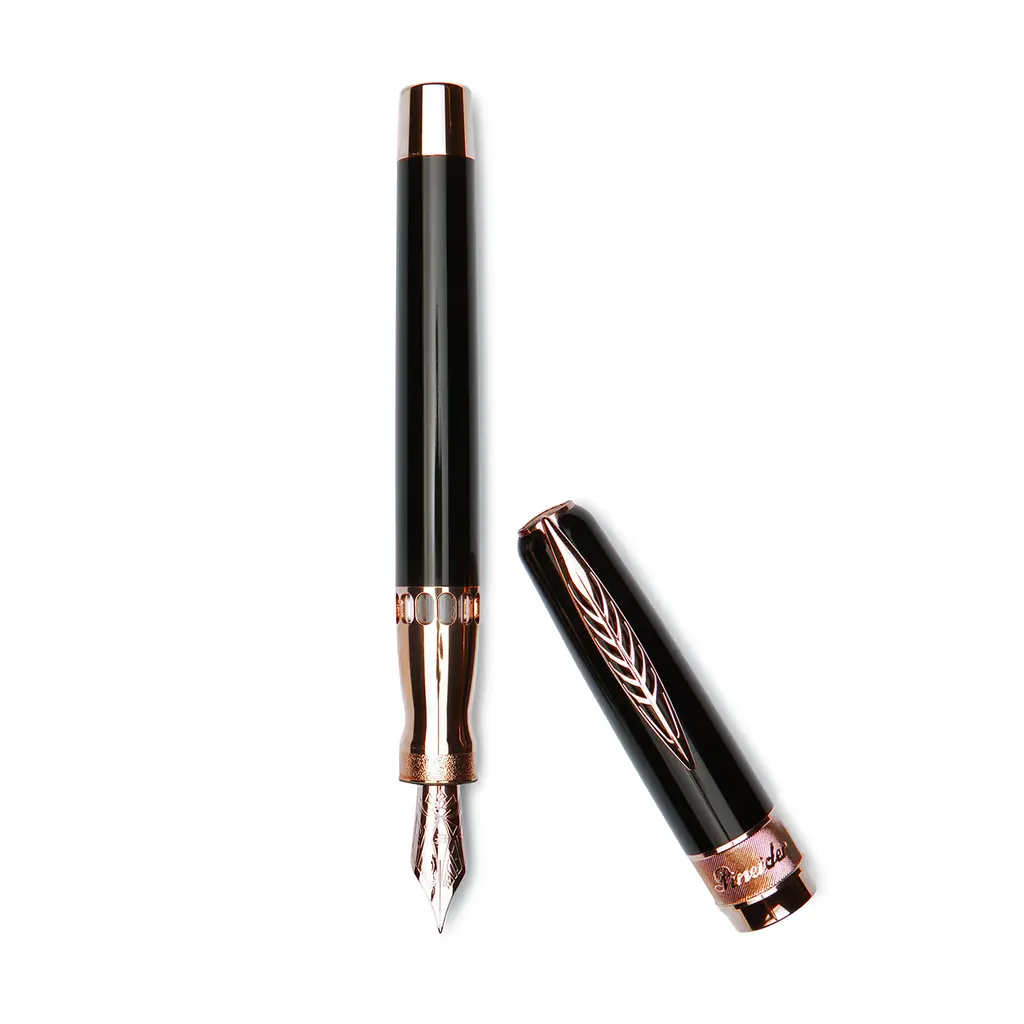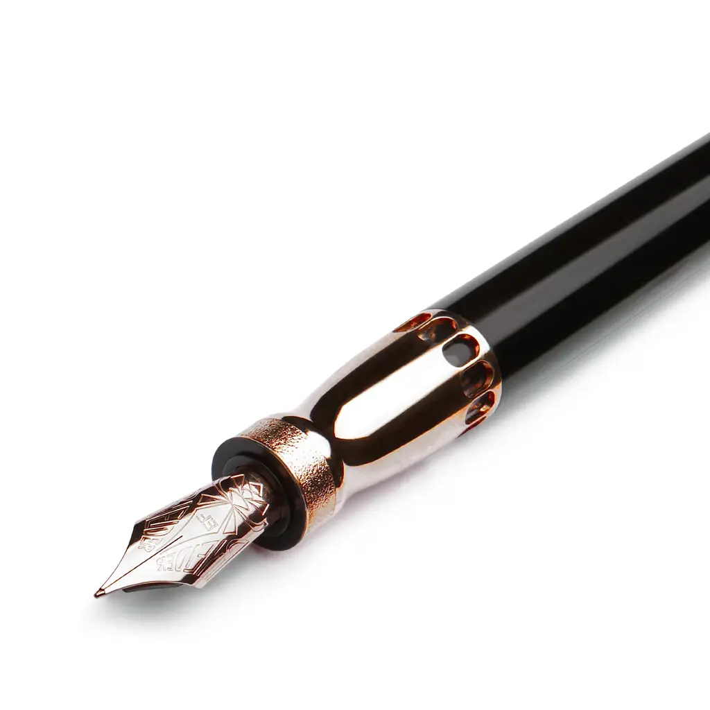 Combining a deep black body with luxurious rose gold trims, this fountain pen balances modern allure and classic style. Its expertly designed nib glides seamlessly across the paper, offering a rich and fluid writing experience. Designed for elegance, it’s perfect for formal settings, special notes, or as a meaningful gift. A statement of taste and craftsmanship, it transforms writing into a moment of quiet indulgence.