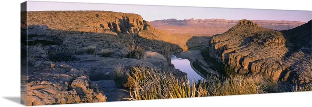 Panoramic photograph of huge rocks and canyons in river under a clear sky.