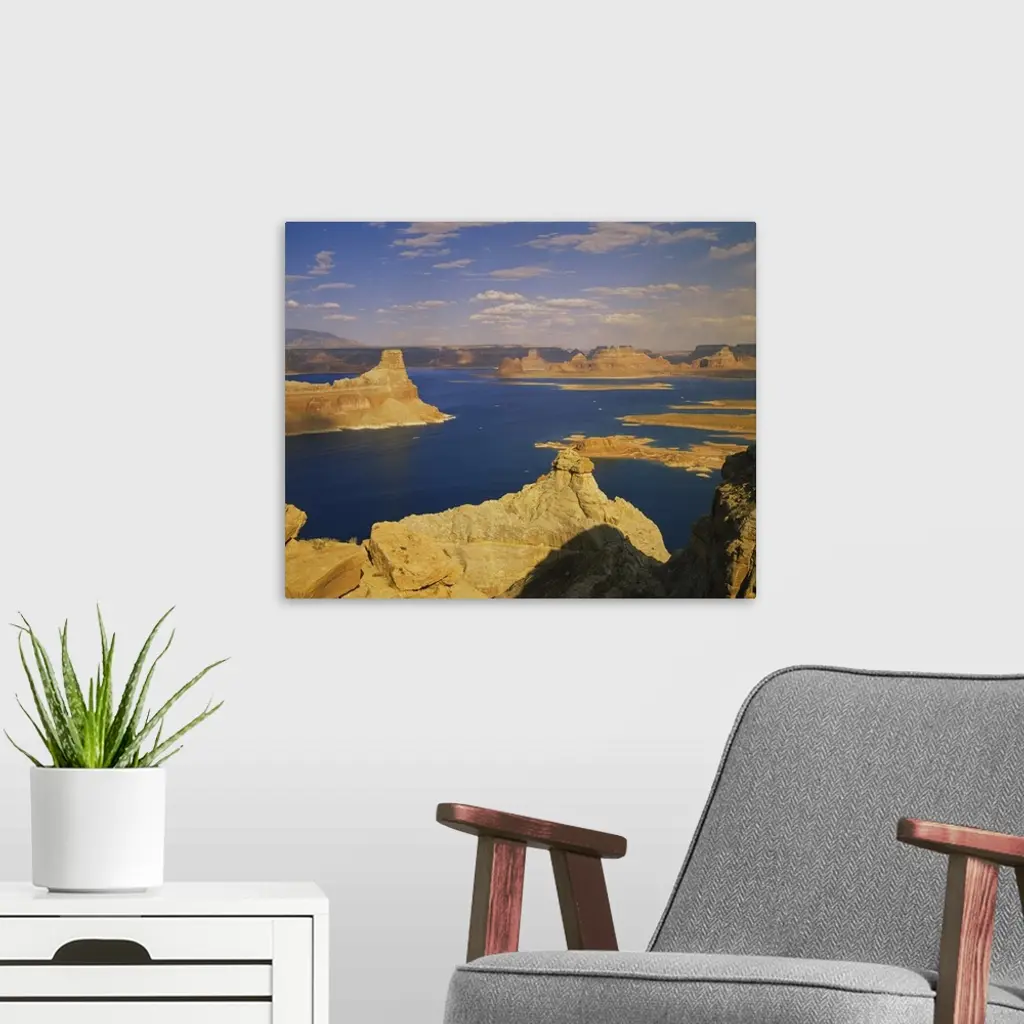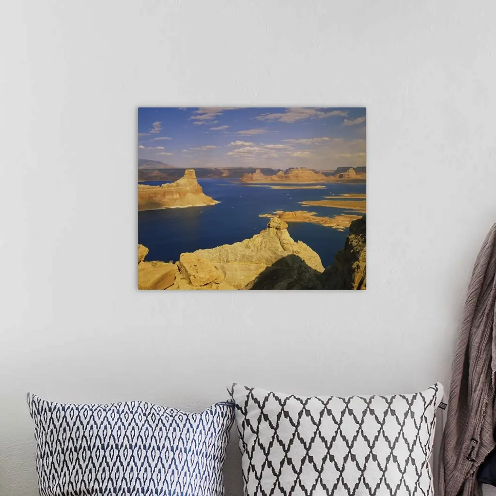 Rock formations at a lake, Gunsight Butte, Lake Powell, Glen Canyon National Recreation Area, Arizona, Utah wall art for home and office decor. Discover canvas art prints, photos, mural, big canvas art and framed wall art in GreatBigCanvas.com's varied collections.