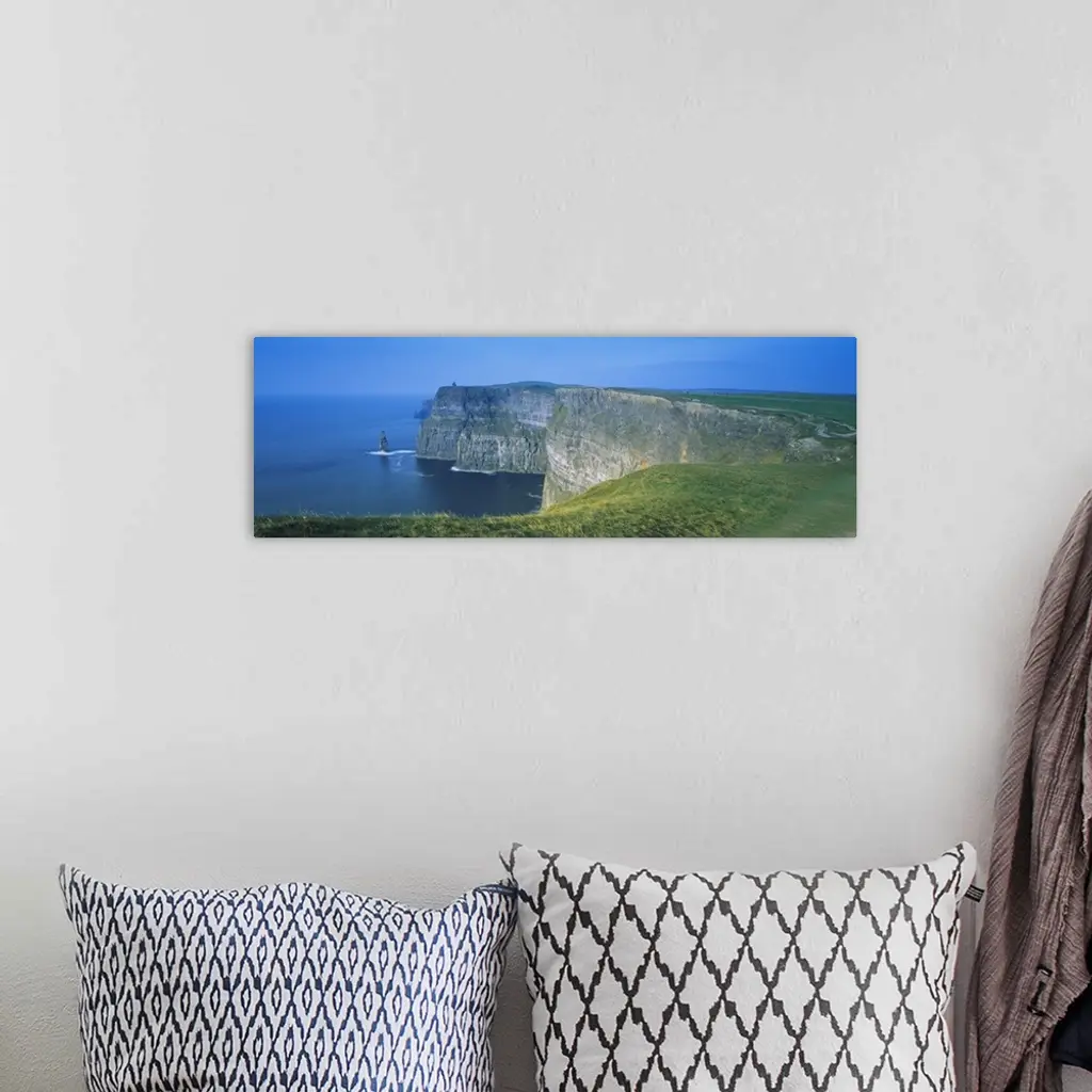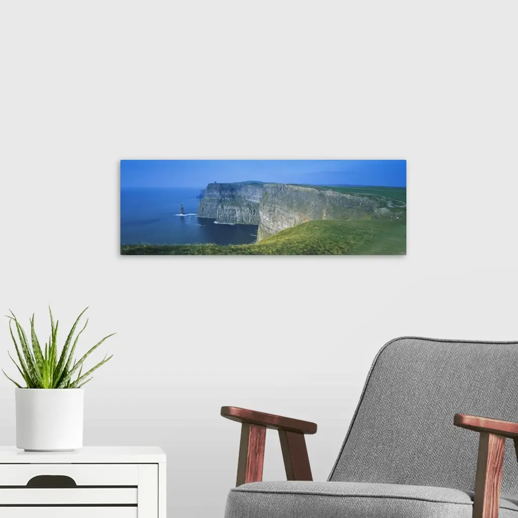 Wide angle photograph of curving, large rock formations of the Cliffs of Moher, leading into the water in County Clare, the Republic of Ireland.