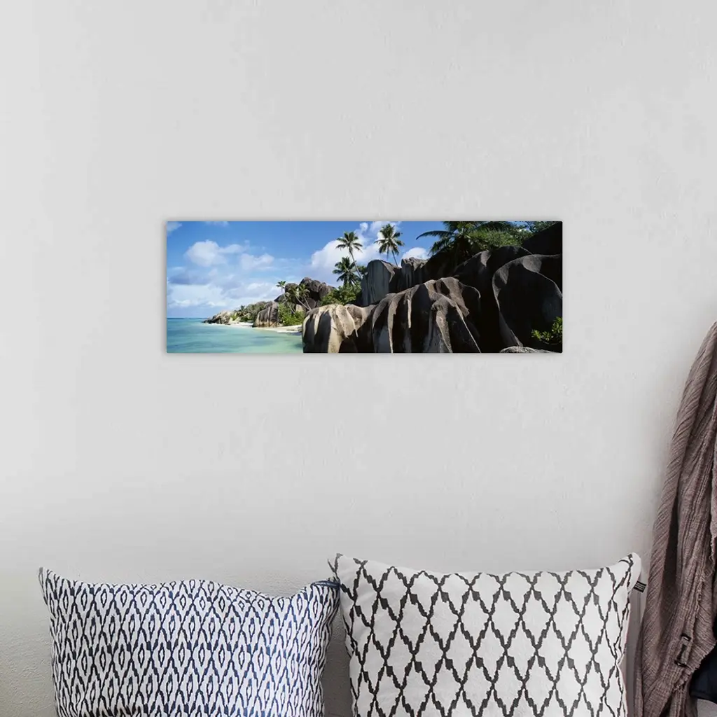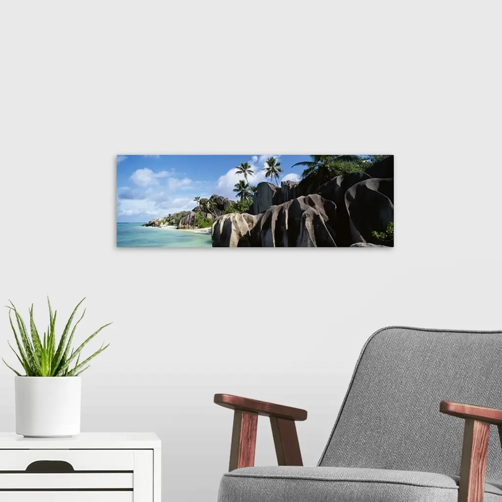 Rock formations on the beach, Anse Source Dargent Beach, La Digue Island, Seychelles wall art for home and office decor. Discover canvas art prints, photos, mural, big canvas art and framed wall art in GreatBigCanvas.com's varied collections.