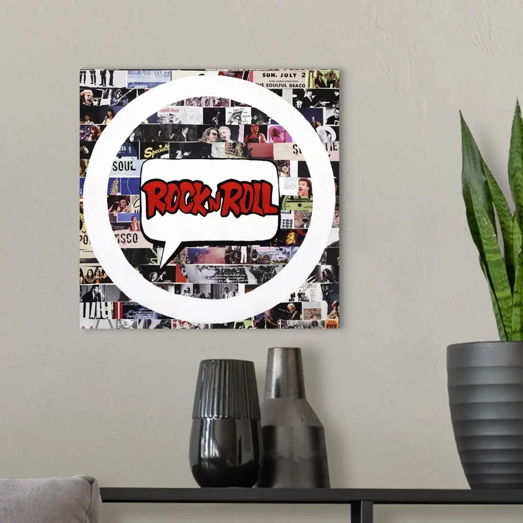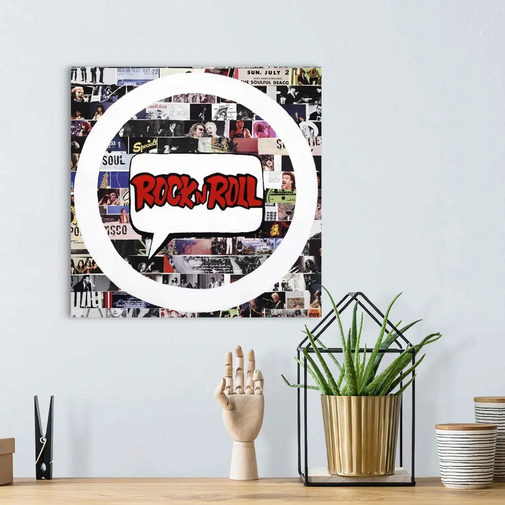 A square collage with "Rock n Roll" in the center and images of famous musicians in the background.