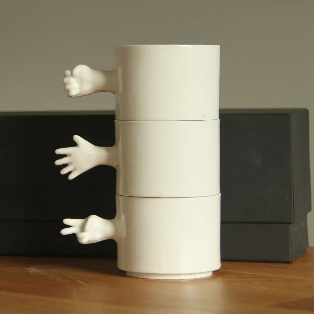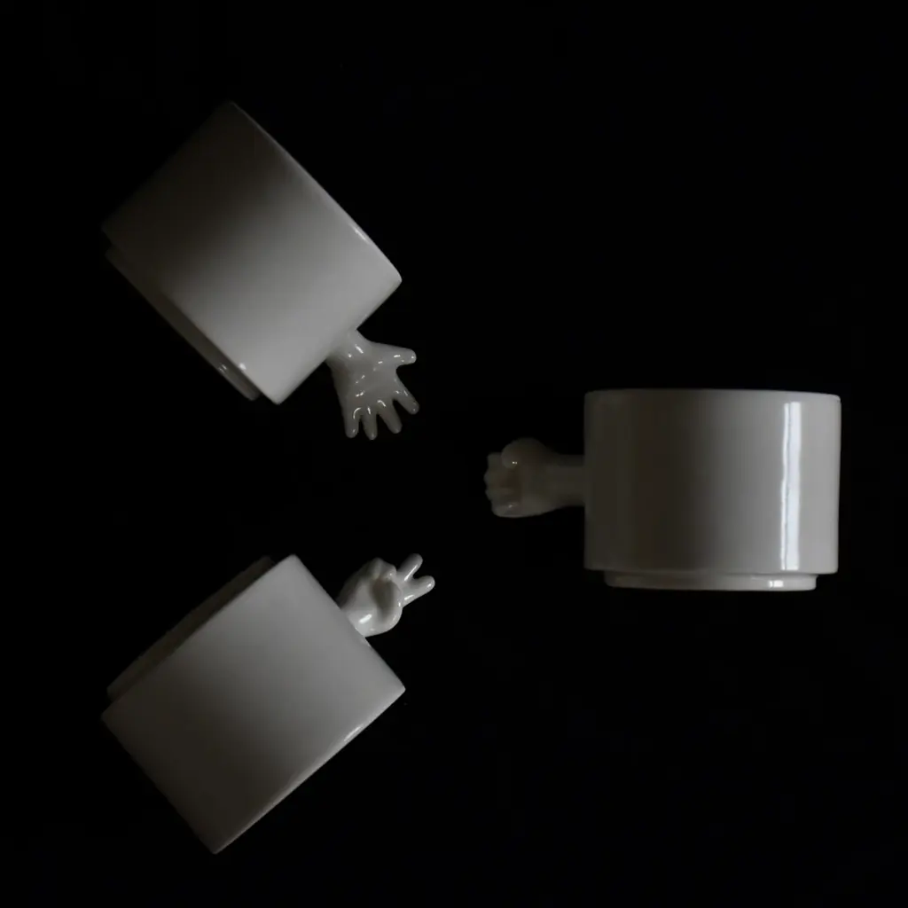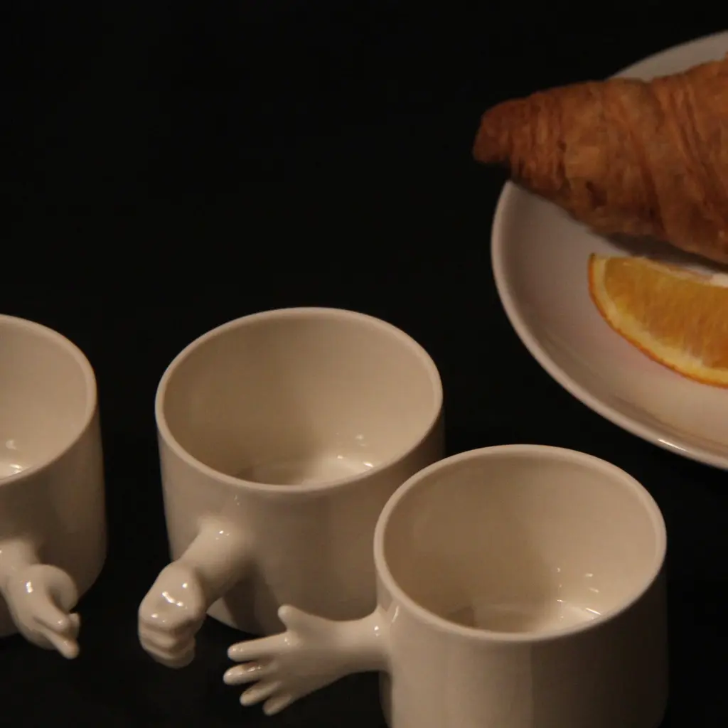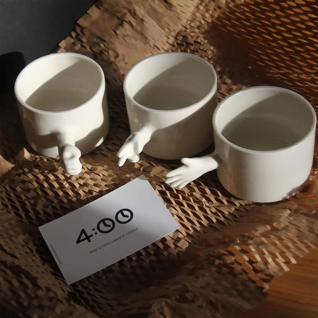 The ‘GESTURE CUPS’ series by 4AM Product Design captures human gestures through porcelain cups, crafted using throwing and slip casting techniques. The collection features a rock-paper-scissors set, with each cup symbolizing a classic gesture, adding interactivity and playfulness.