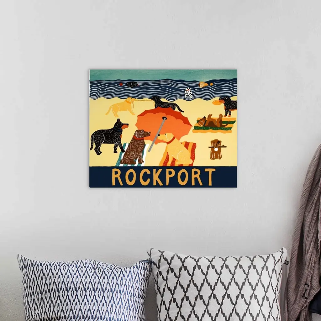 Illustration of multiple breeds of dogs having a beach day with "Rockport" written on the bottom.