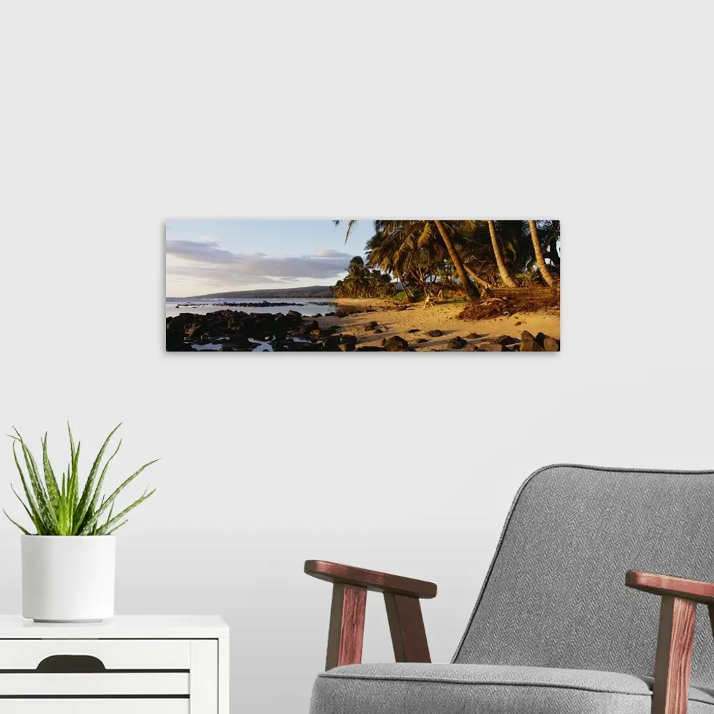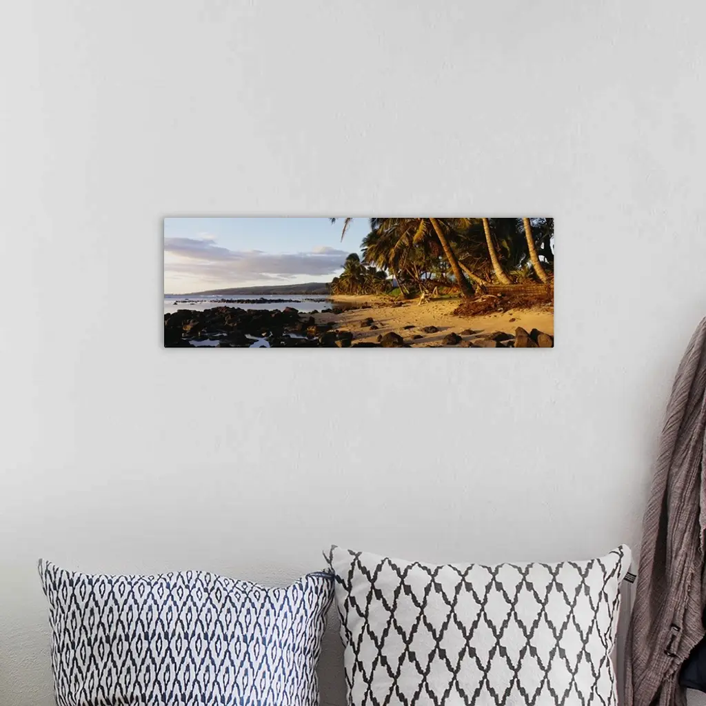 This decorative wall art is a panoramic photograph of sunset on a tropical beach covered with volcanic boulders and lined palm trees.