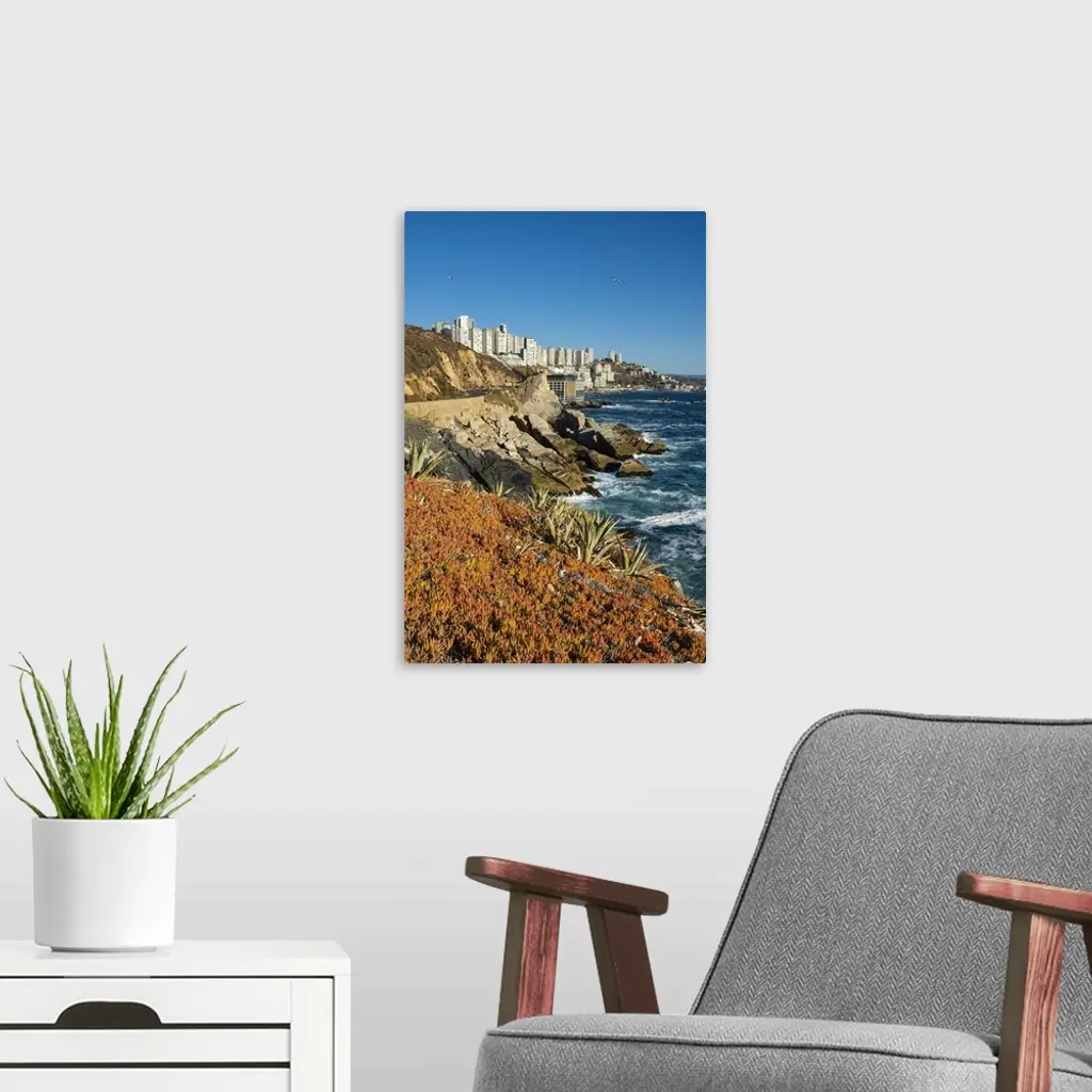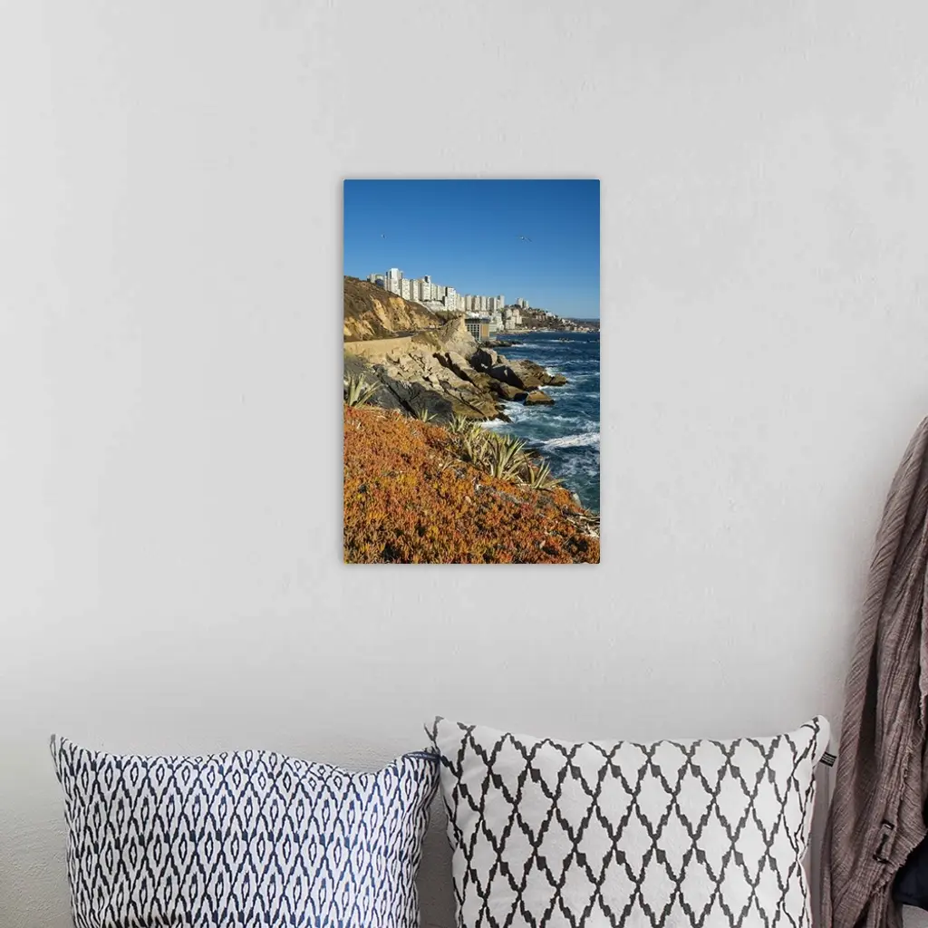 Rocky coastline by Roca Oceanica with distant view of residential high-rise buildings in Renaca, Concon, Valparaiso Province, Valparaiso Region, Chile