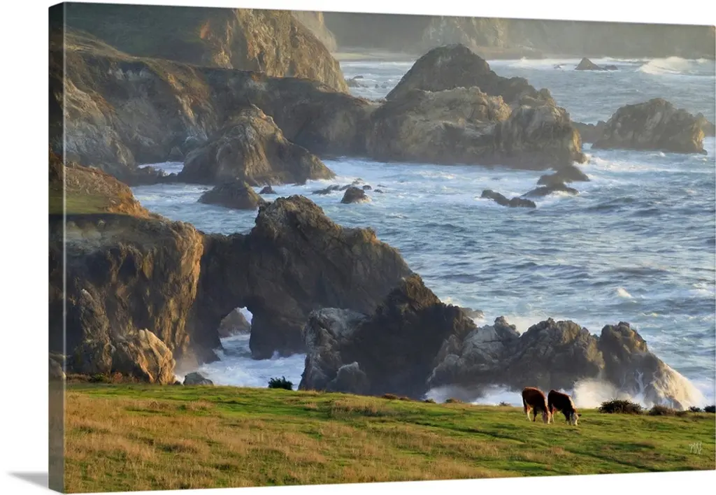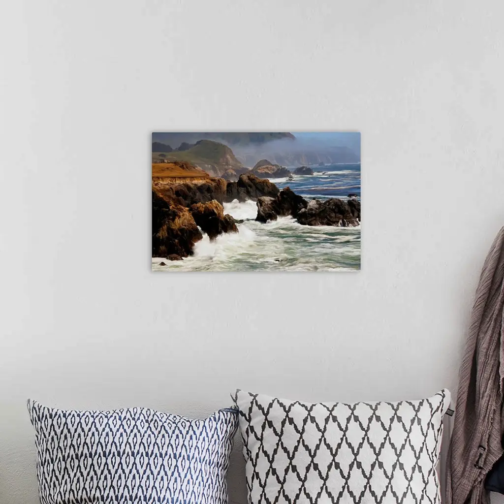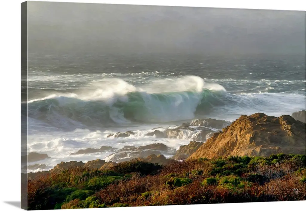 Seagulls perched on a rock formation have a spectacular view of waves crashing on the rugged Big Sur coast. In the distance, shrouded a little bit by incoming fog, is the Rocky Creek Bridge, over which passes Highway One. Acclaimed artist Michael Lynberg adds an impressionistic touch to his work, making each piece unique and alluring.