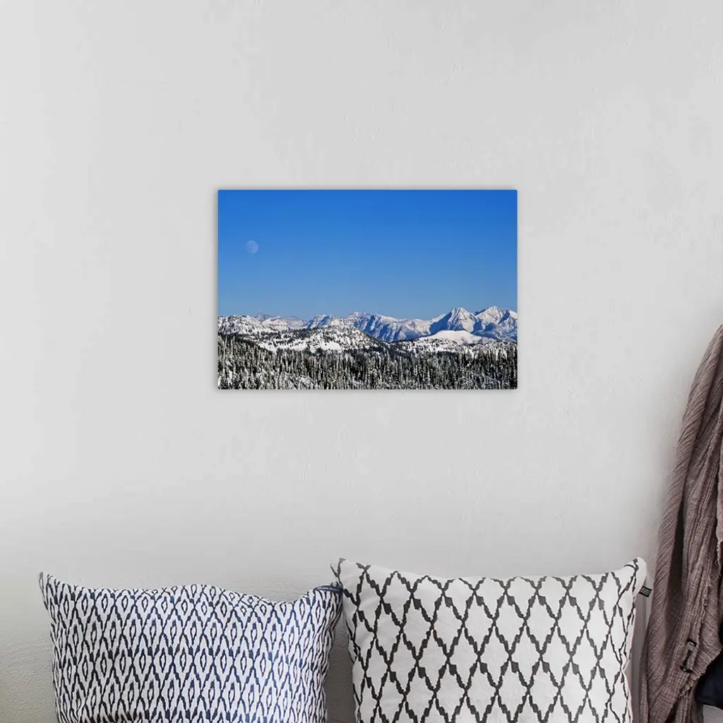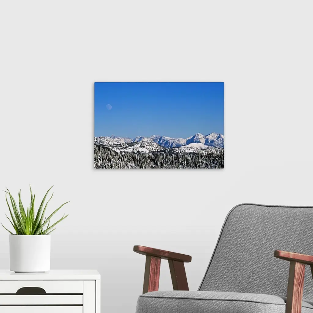Rocky Mountains & spine of Continental Divide in Glacier National Park, MT during winter seen from Whitefish Range.