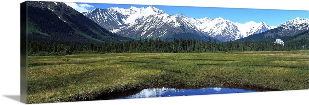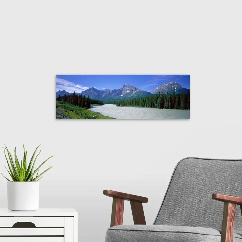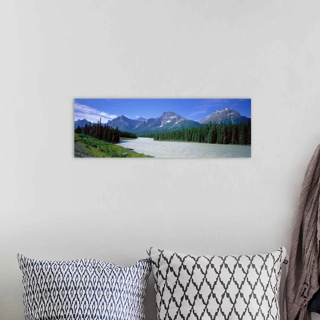Panoramic photograph of river winding through forest with mountain range in the distance under a cloudy sky.