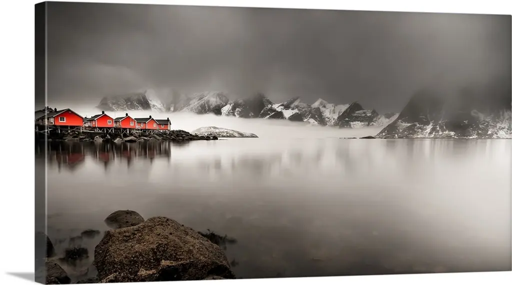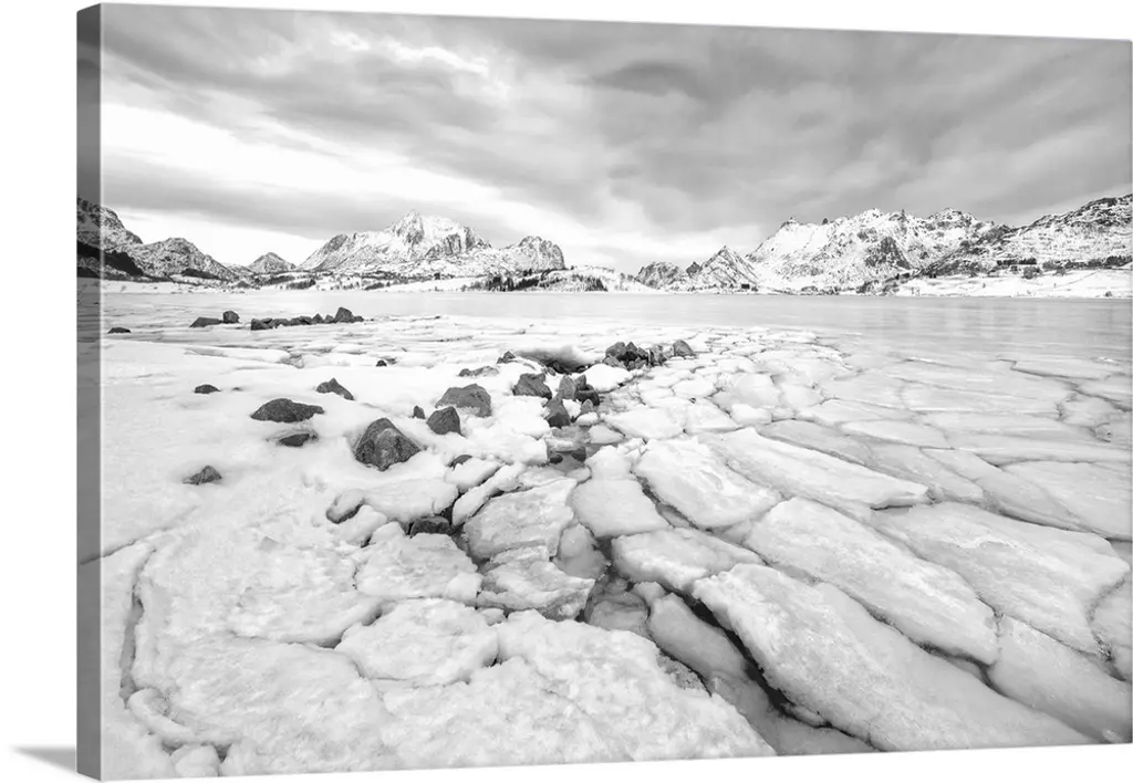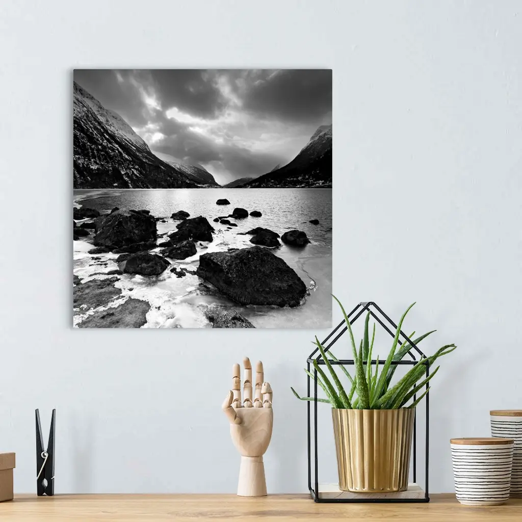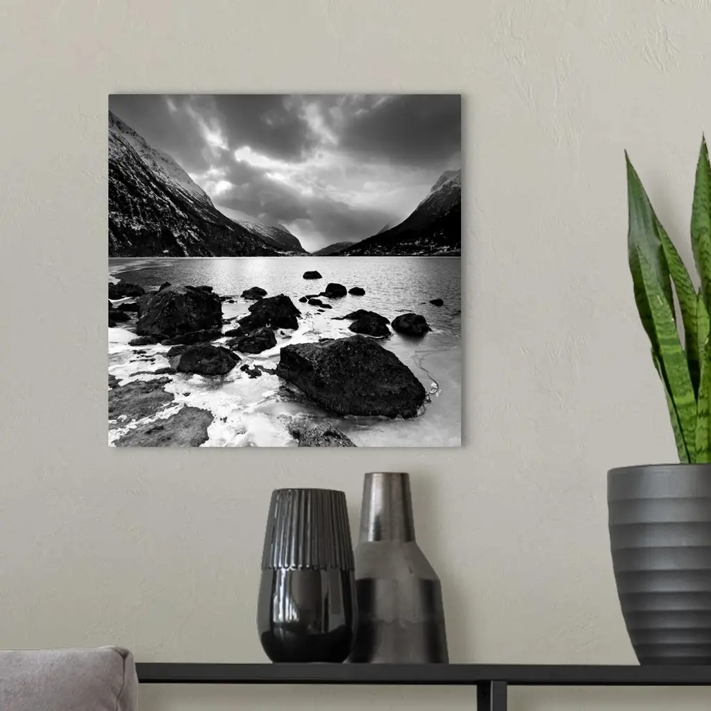 Rocky shoreline with mountains in the distance wall art for home and office decor. Discover canvas art prints, photos, mural, big canvas art and framed wall art in GreatBigCanvas.com's varied collections.
