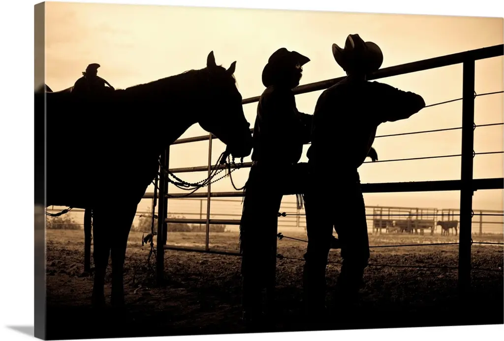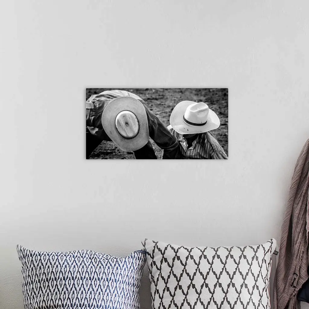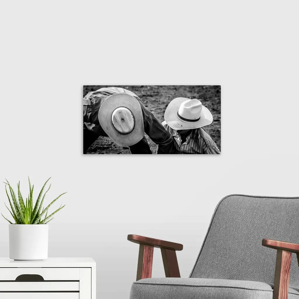 Black and white photograph of two people wearing cowboy hats on the ground at a rodeo.