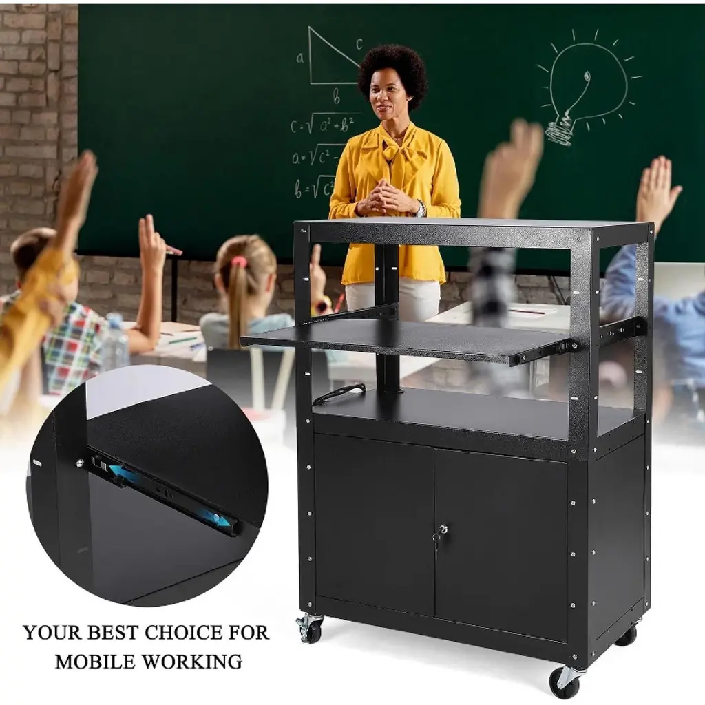 With its secure storage space and height adjustable design, this rolling AV trolley is ideal for multiple scenarios. Equipped with a lockable storage area to ensure that equipment is securely protected while on the move, it provides a peace of mind storage solution whether it's presentation equipment or office supplies, allowing you to focus on your work without worry. Adjustable in height from 24 to 42 inches to provide the best ergonomic experience whether you are sitting or standing, the flexible design allows you to adjust the height according to your needs to ensure comfortable and convenient operation, adding convenience and comfort to your daily work. Equipped with a pull-out tray and foldable side shelves, it can accommodate multiple screens, laptops or projectors, maximising workspace and enhancing functionality, providing efficient solutions for multitasking and displaying equipment, making work easier. Equipped with four omni-directional swivel wheels and two locking brakes, it becomes an ideal choice for mobile workstations, which can be easily moved to different positions in the office, classroom or conference room, providing a flexible operating experience to meet the needs of use in multiple scenarios. Featuring sturdy steel shelves that can carry up to 100lbs when evenly distributed, with non-slip safety pads, an efficient cable management system and a secure locking mechanism, it provides excellent safety and reliability, carrying a steady load and becoming a long-lasting companion in the workplace, whether it's for everyday use or heavy-duty tasks.