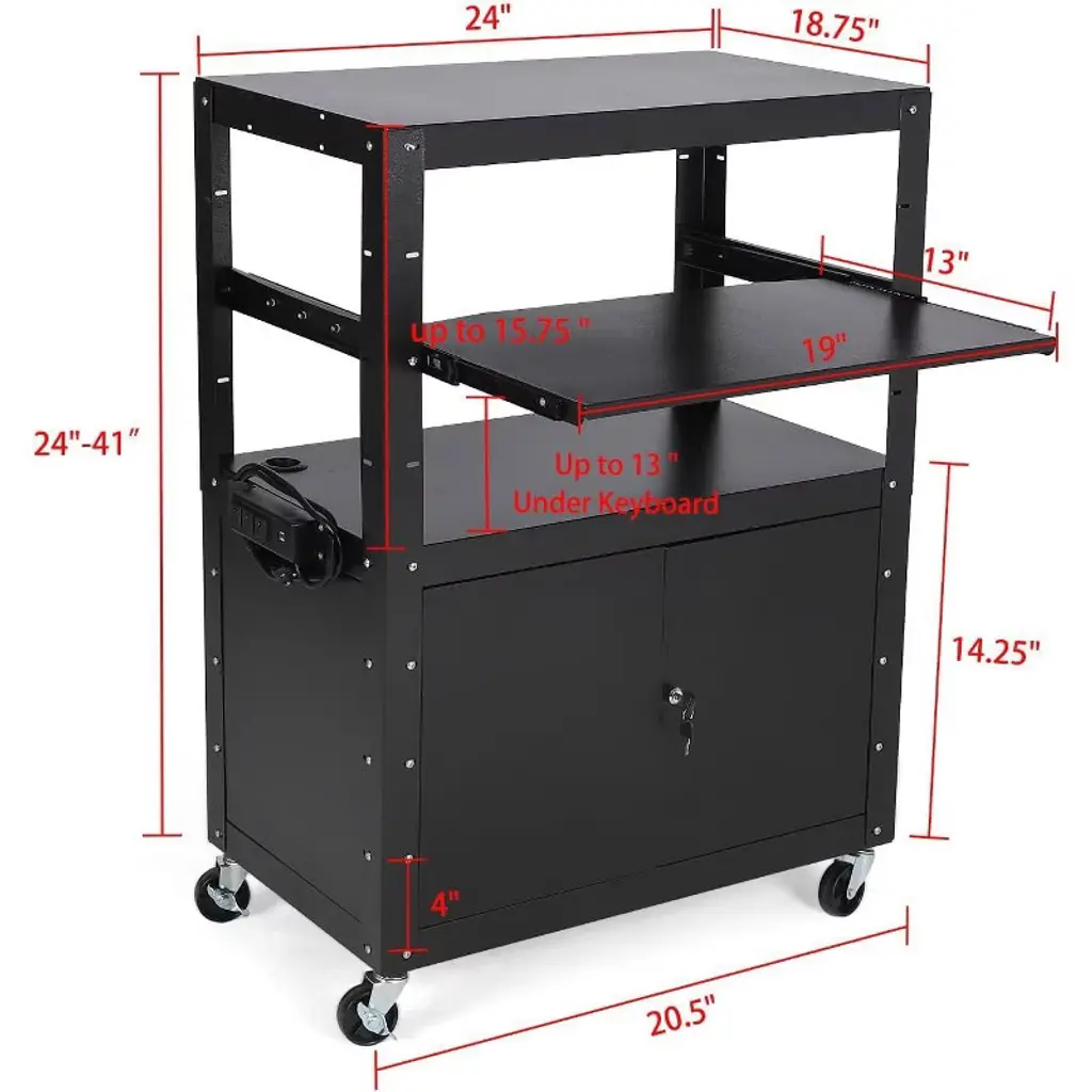 Rolling Av Cart, Height Adjustable Mobile Workstation, Lockable Cabinet, Laptop Stand And Folding Blade, Home Or Office, Black