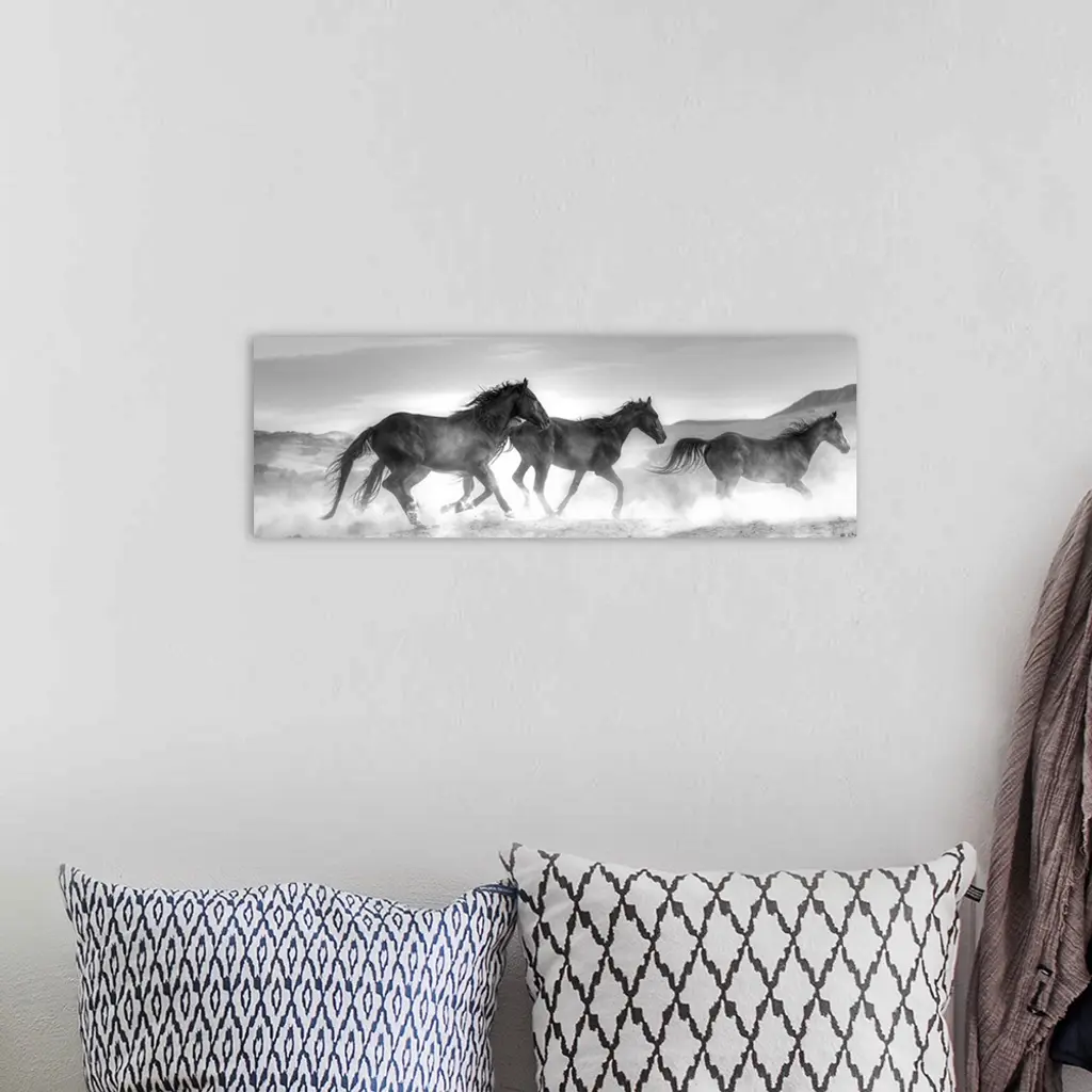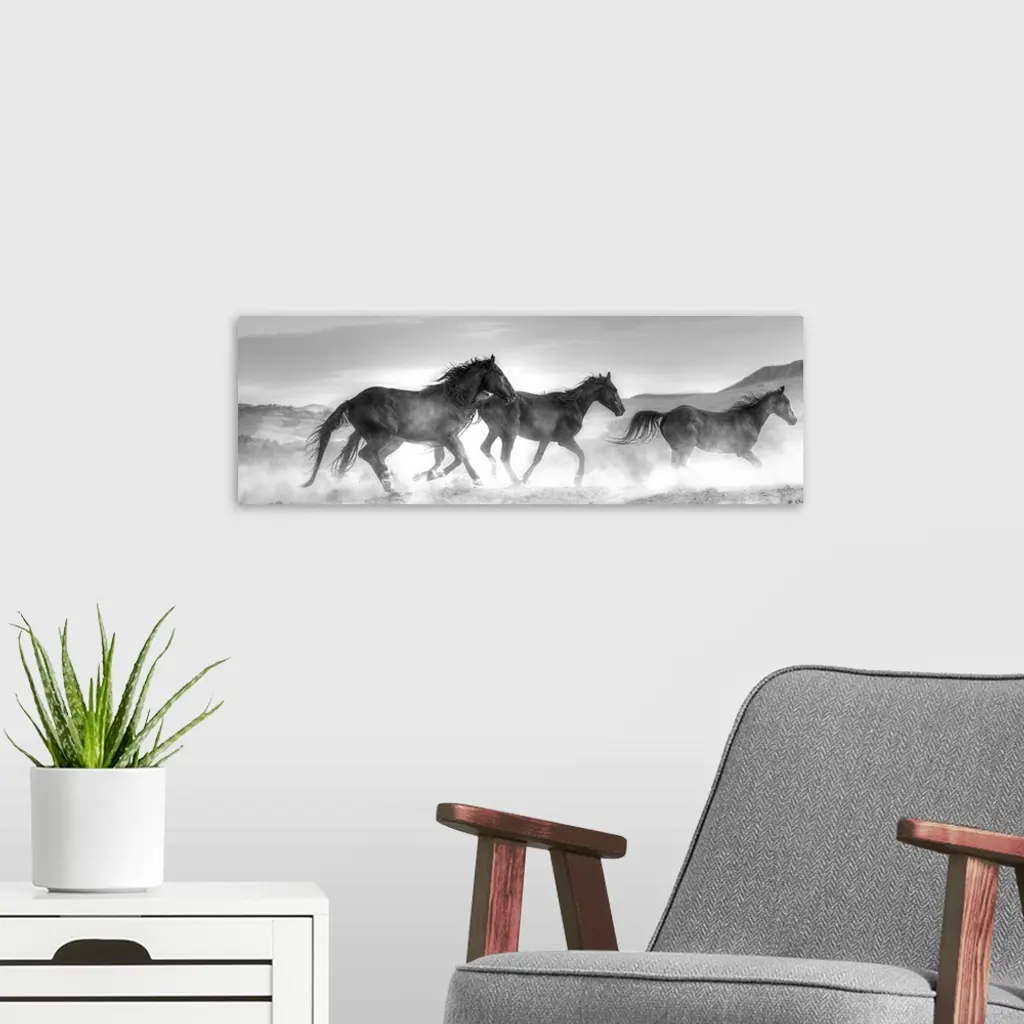 Photograph in black and white of three horses running in a cloud of dust by Sally Linden.