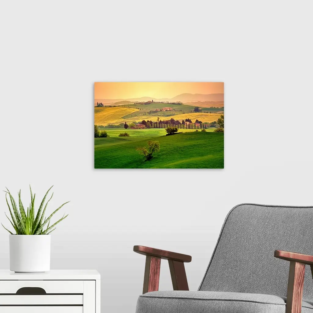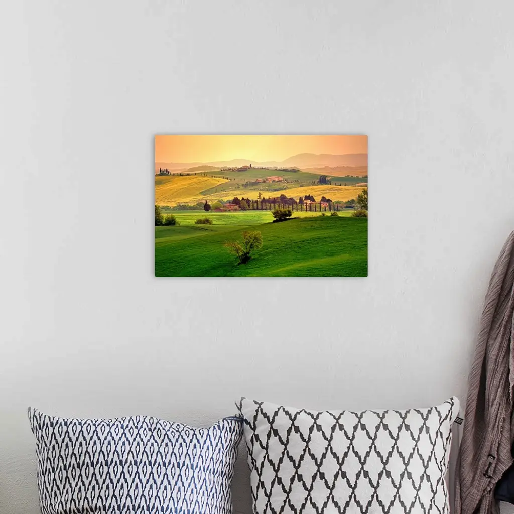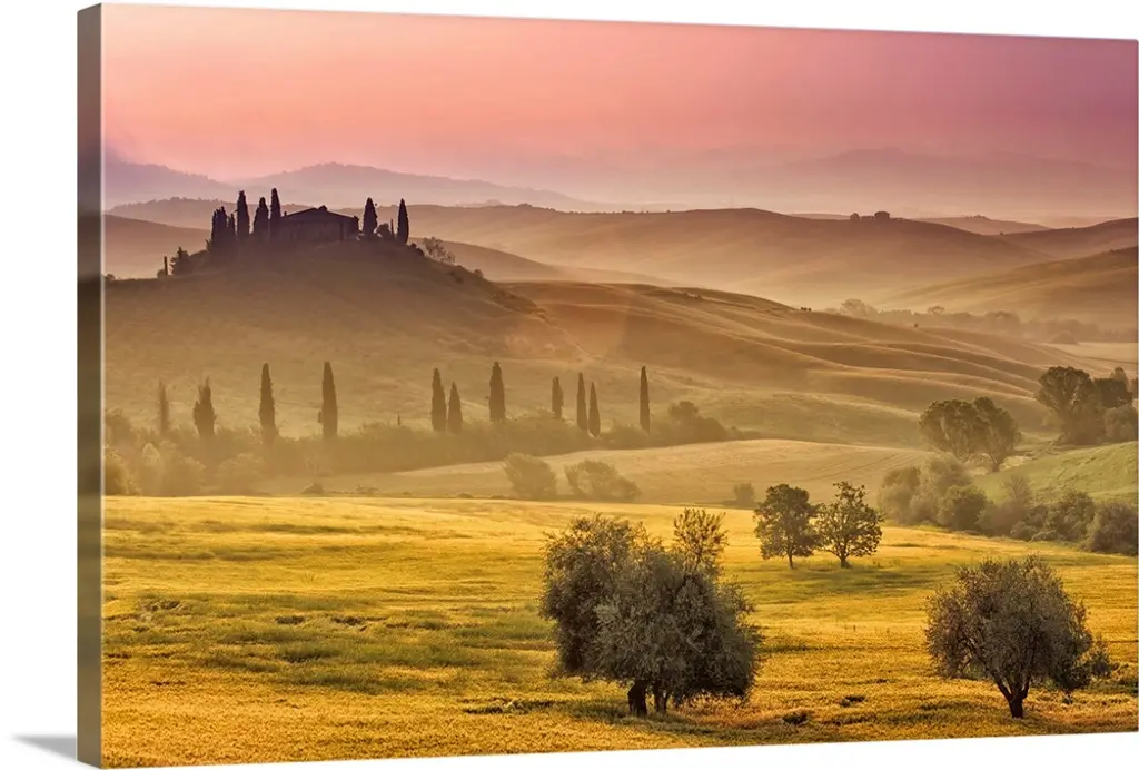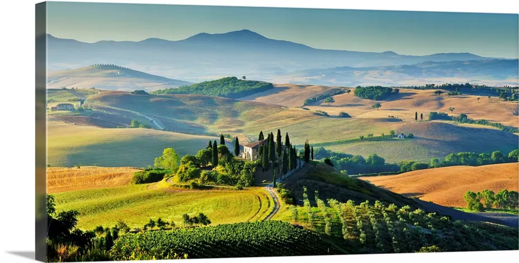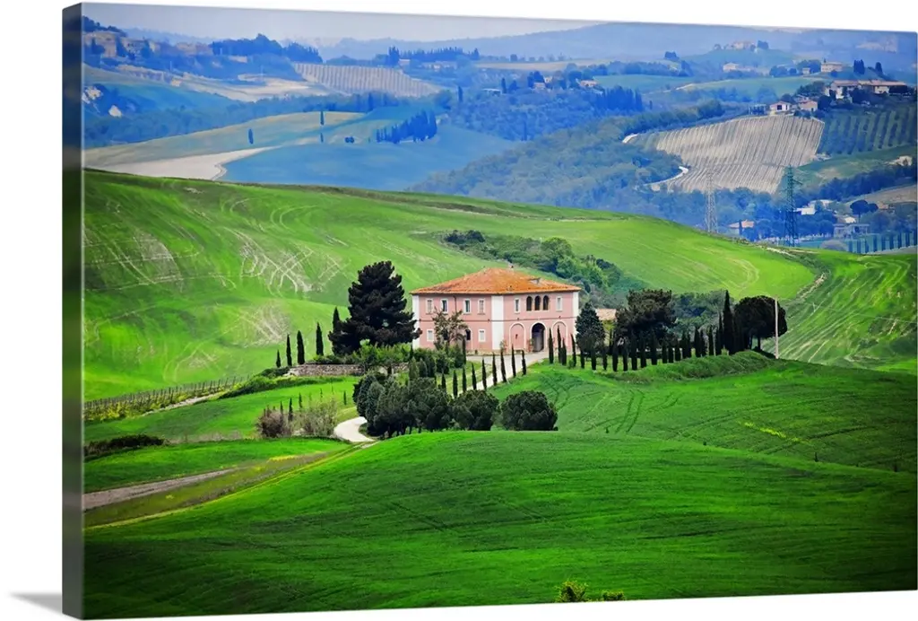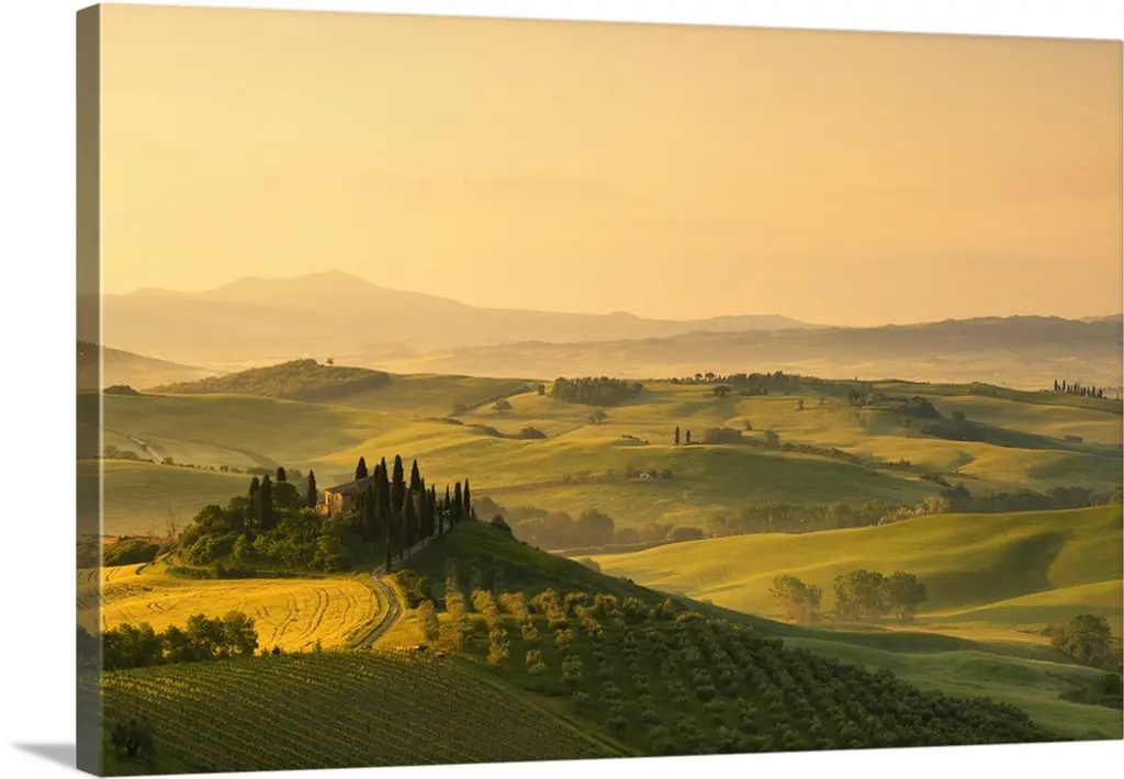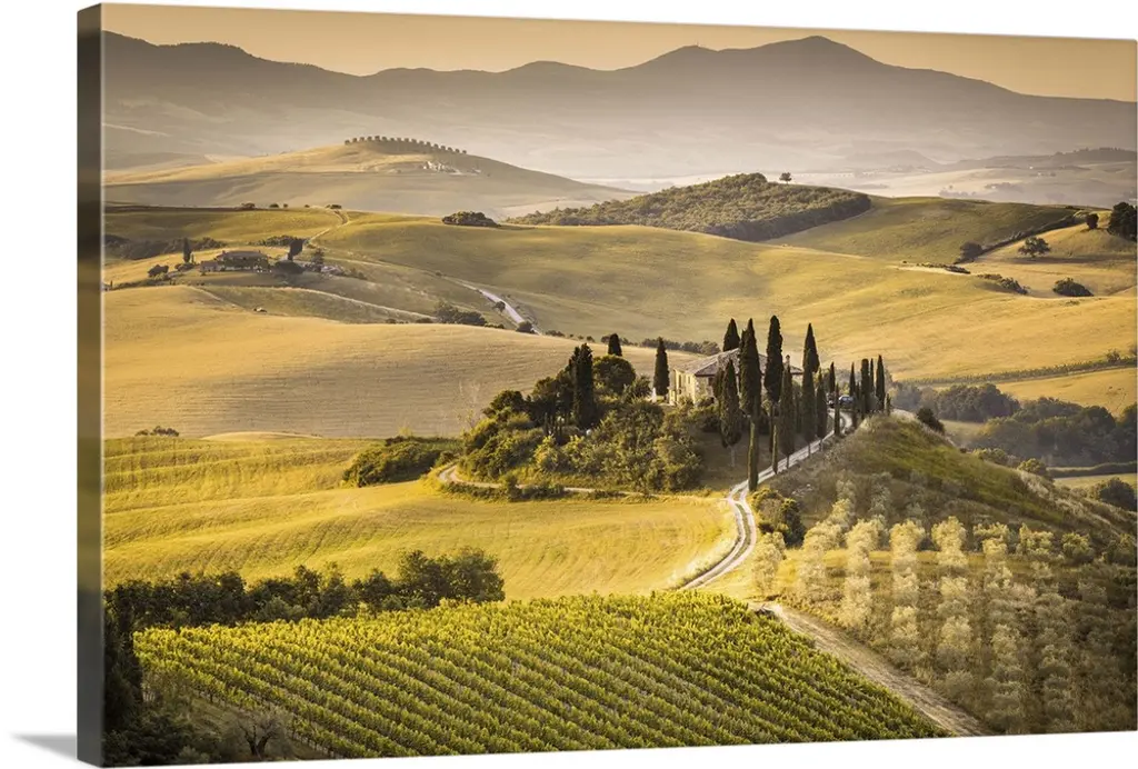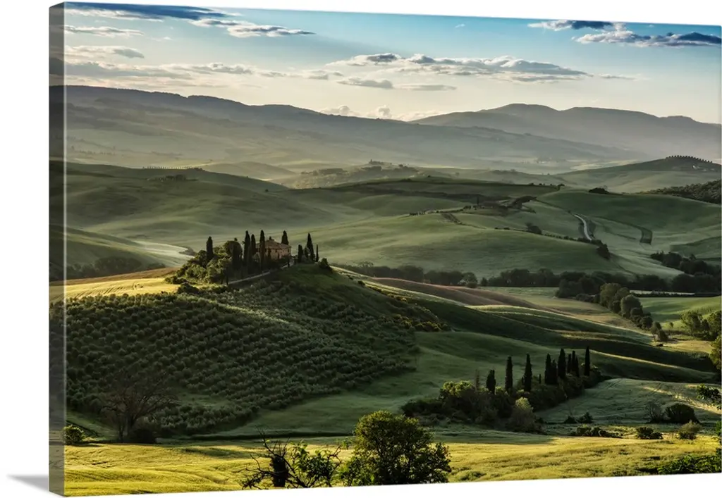 Photograph of hillsides with mountain silhouettes in the background. The hills are covered with homes, trees, bushes, and fences.