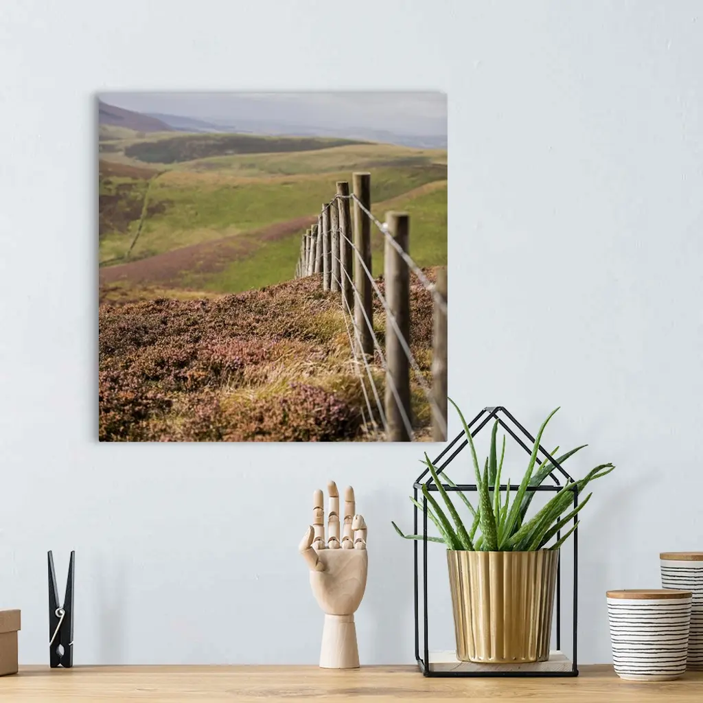Square photograph of a fence running though rolling hills in an Edinburgh countryside, Scotland, UK