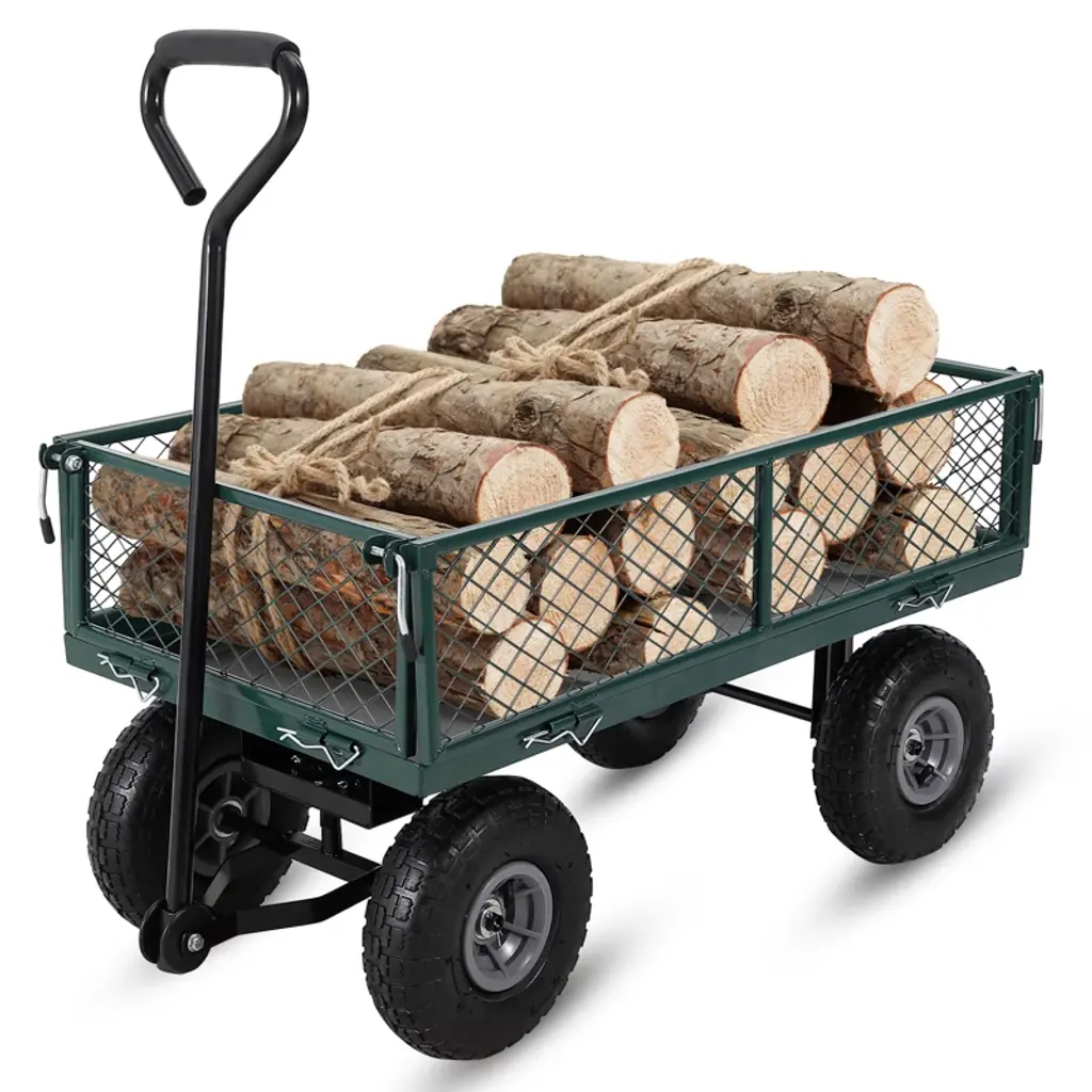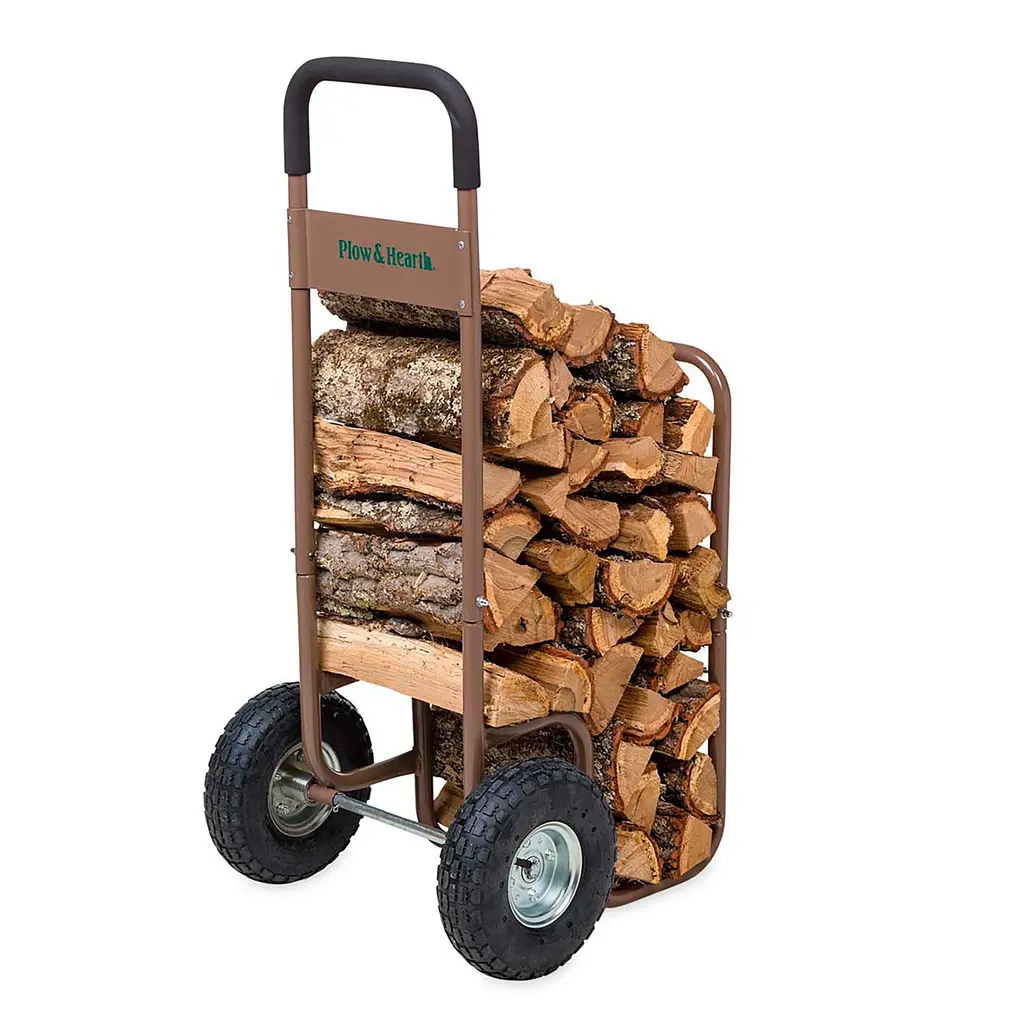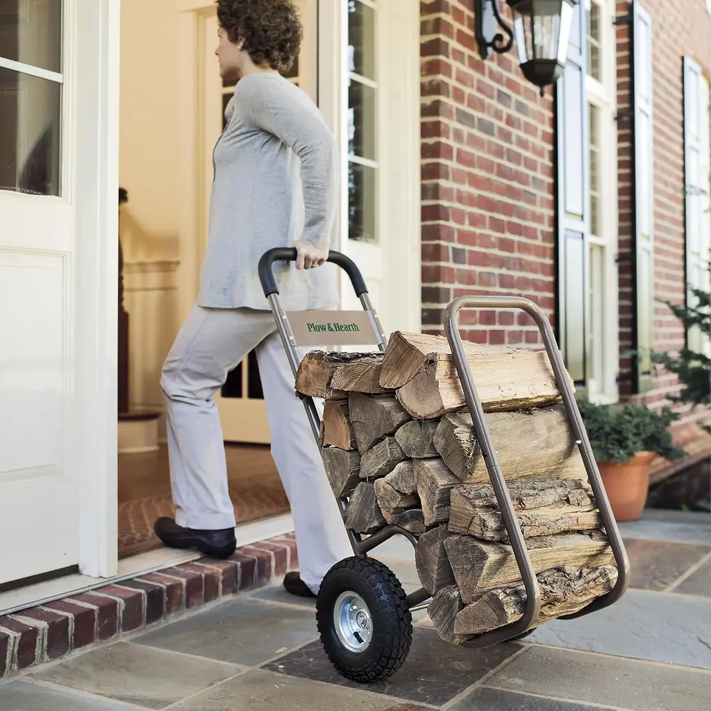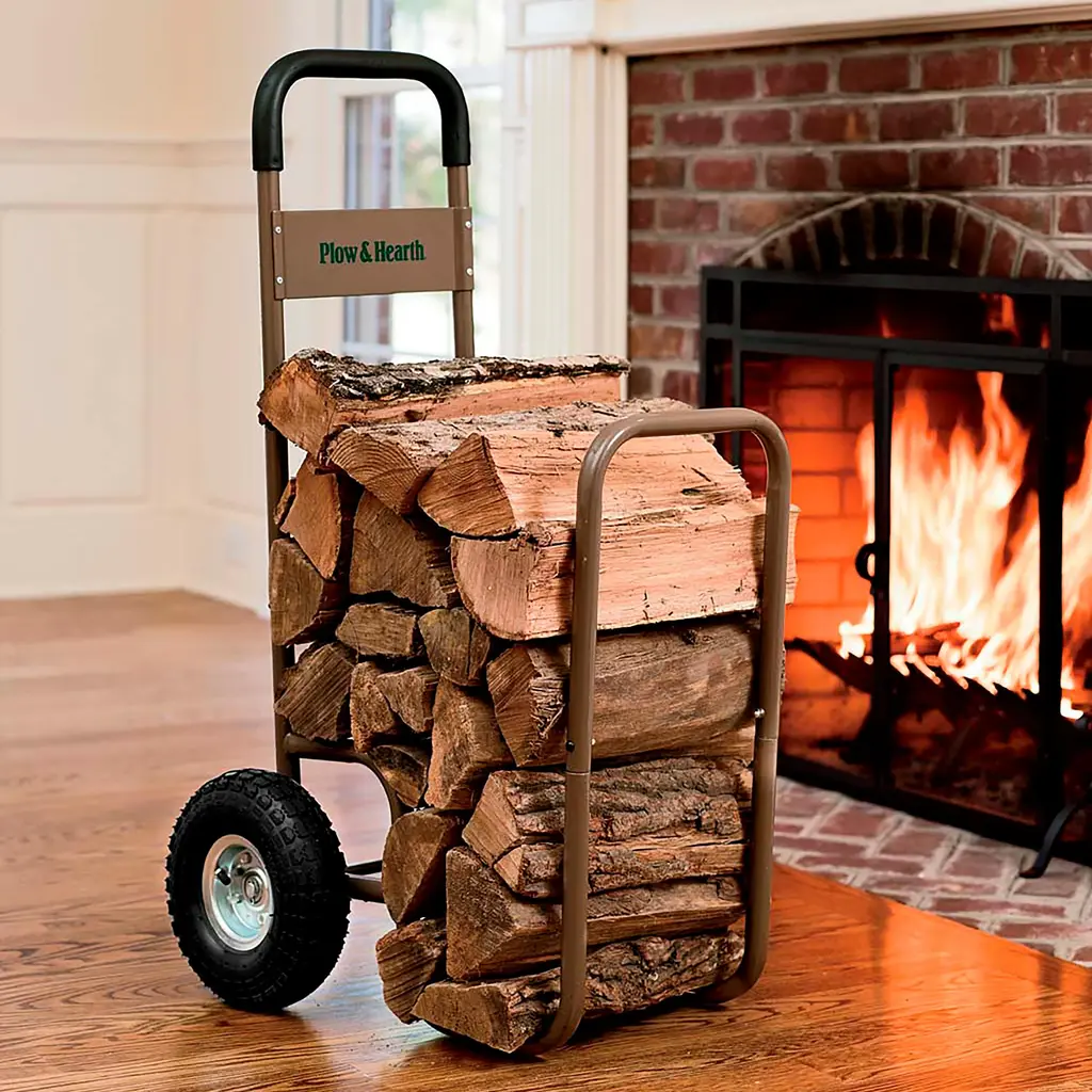 Our Rolling Wood Cart easily moves big loads of firewood. Made of durable tubular steel with smooth-rolling pneumatic tires, it makes the chore of hauling wood a breeze – roll it right into the house!Dark bronze hammered-look finish is elegant enough to store by the fireplace, yet tough enough to stay on porch. Easy assembly.