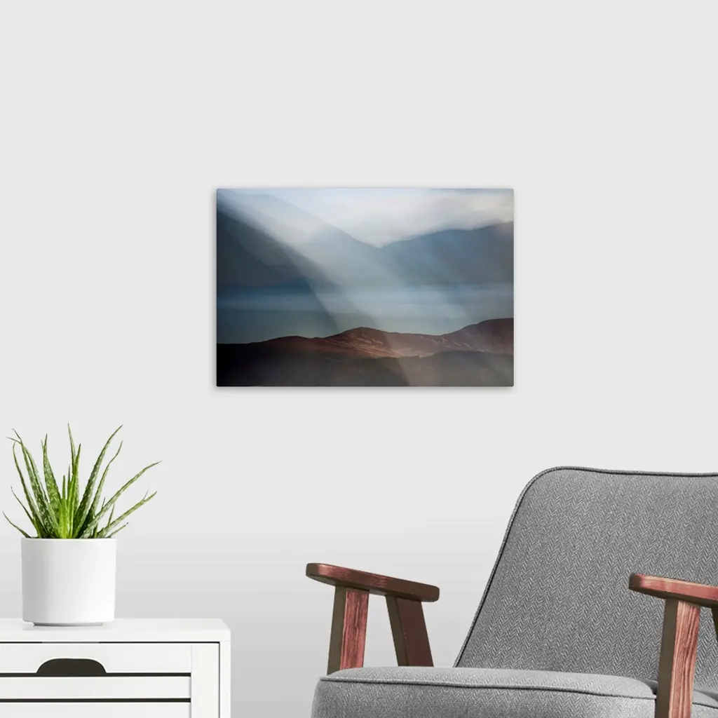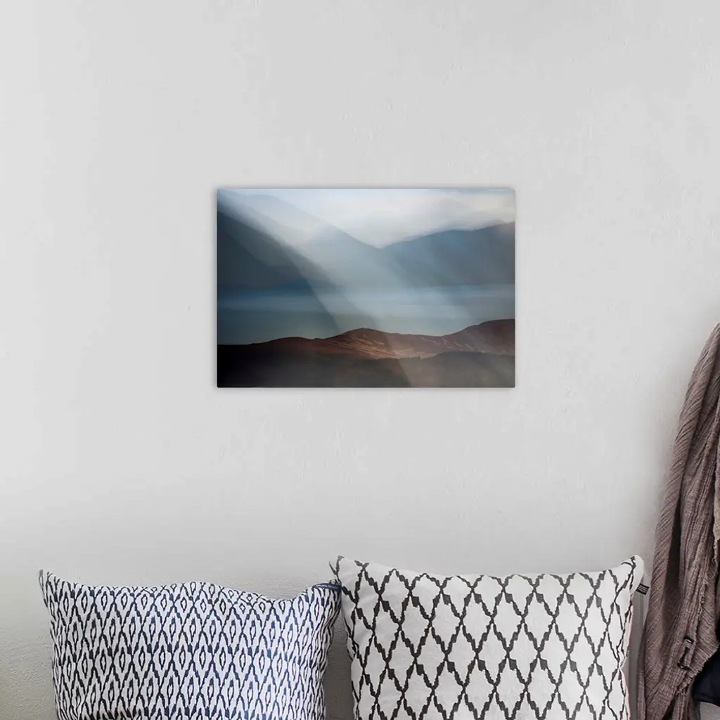 Dreamy landscape photograph of Loch Morlich in Scotland with rolling hills in the background and foreground.