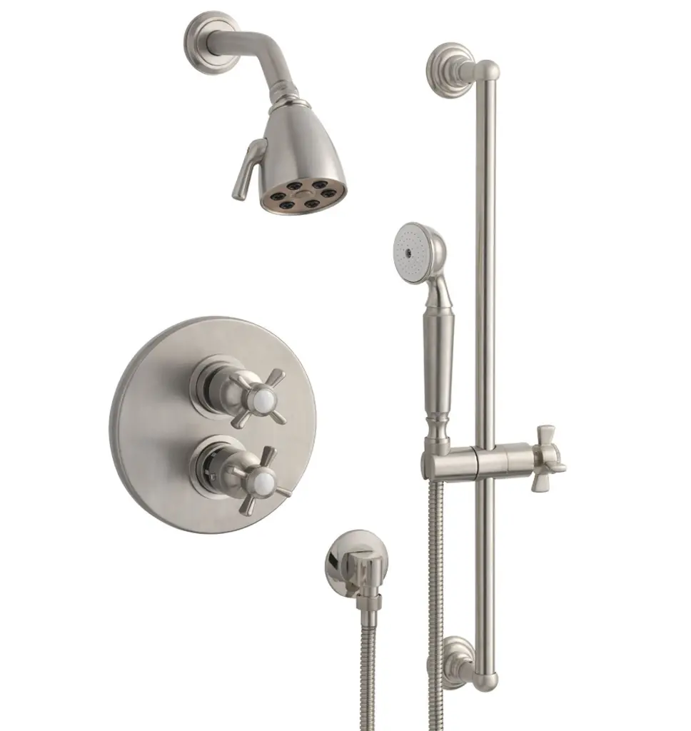 Rounded cross handles, porcelain buttons, and a "stepped" escutcheon make the Rollins collection the perfect choice for a traditional bath. The Rollins Thermostatic Shower Set With Handheld includes a coordinating shower arm and an anti-scald thermostatic valve that controls the shower head and hand shower. Choose from 5 shower head options (sold separately).Designed in collaboration with Watermark, a plumbing mainstay for over 30 years, our collection of timeless solid-brass faucet and shower sets are manufactured, assembled, and finished in their Brooklyn factory.