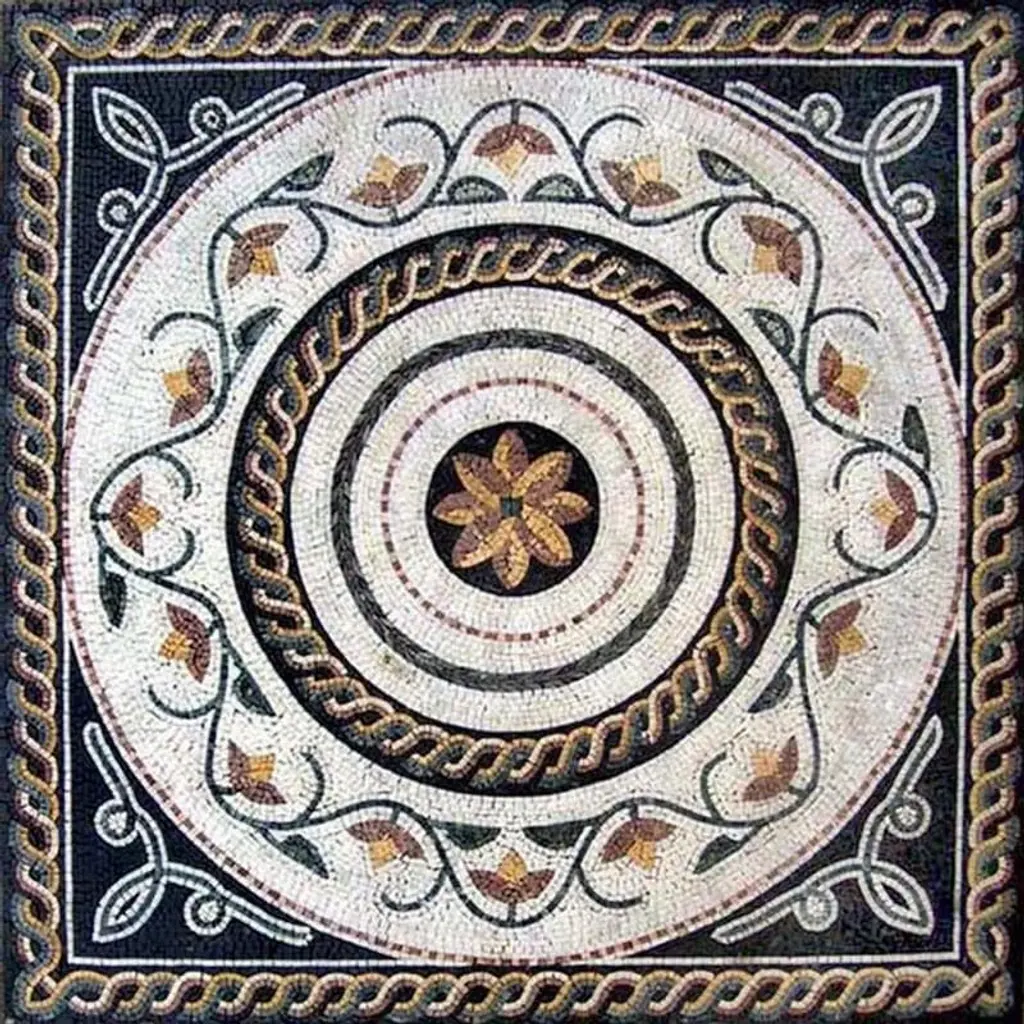 Introducing the Roman Floral Mosaic Panel - Vida, a stunning piece that captures the timeless elegance of ancient Roman artistry. This exquisite mosaic draws inspiration from classic Roman artifacts, bringing a touch of history and sophistication into your home. Each panel is meticulously handmade from high-quality natural stone and marble tiles, ensuring that every piece is unique and showcases the beauty of artisanal craftsmanship.The mosaic features a captivating floral motif, intricately designed with graceful concentric circles that create a mesmerizing visual effect on a soft ivory background. Black accents thoughtfully interspersed throughout the design add depth and contrast, enhancing the overall aesthetic appeal. Framing this elegant motif is a Roman braided border, adding an extra layer of refinement to the piece.Versatility is one of the most appealing attributes of the Roman Floral Mosaic Panel. Whether you’re looking to elevate the ambiance of your kitchen, bathroom, or any living space, this mosaic is perfect for creating a vibrant and colorful kitchen backsplash, a striking feature wall, or an eye-catching floor installation. Its timeless design complements both modern and traditional decor styles seamlessly.One of the standout features of the Vida Roman Floral Mosaic Panel is its easy installation process. Thanks to the mesh backing, you can effortlessly adhere the panel to walls or floors, making it suitable for DIY enthusiasts and professional contractors alike. Transform your space into a stunning masterpiece without the hassle of complicated setups.Bring home the Roman Floral Mosaic Panel - Vida, and embrace the art of ancient Rome in your interior design. Elevate your space with this captivating mosaic that not only reflects historical charm but also stands as a testament to enduring beauty and craftsmanship.