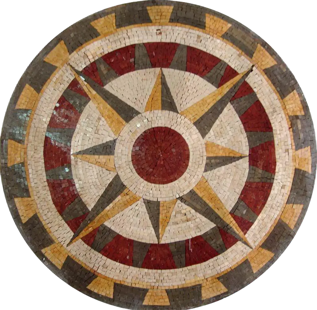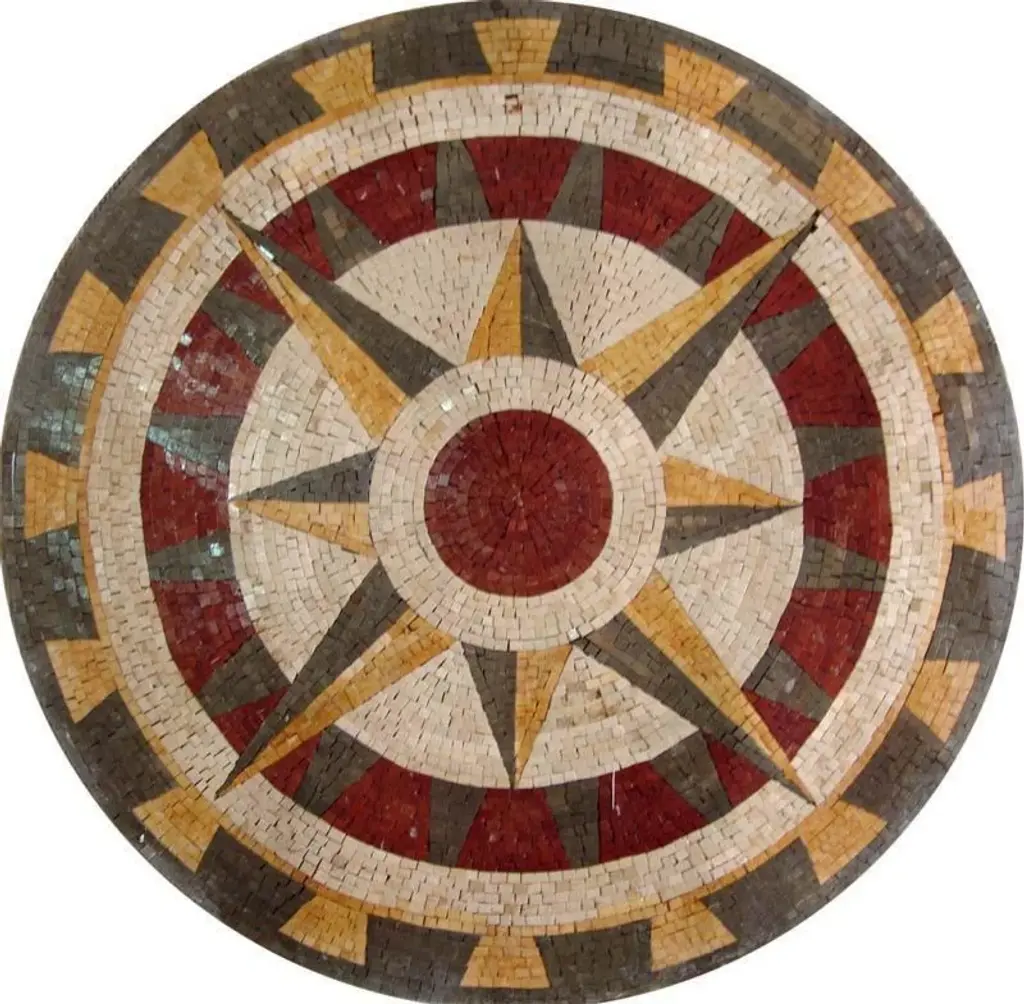 The Ruota Roman mosaic art medallion makes a lovely addition to your kitchen stone tile backsplash. Featuring a wheel design in a mix of grays red and gold with black and white highlights our natural stone medallions are ideal for outdoor installations like exterior walls or pool mosaics. A mesh backing makes it easy to work with.