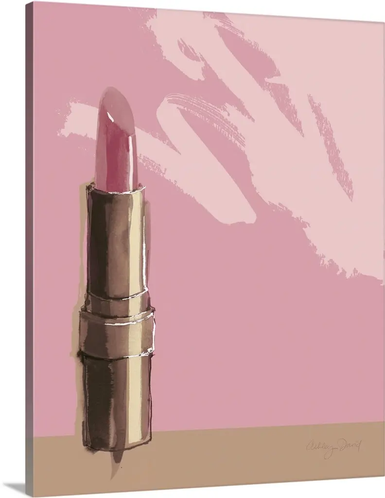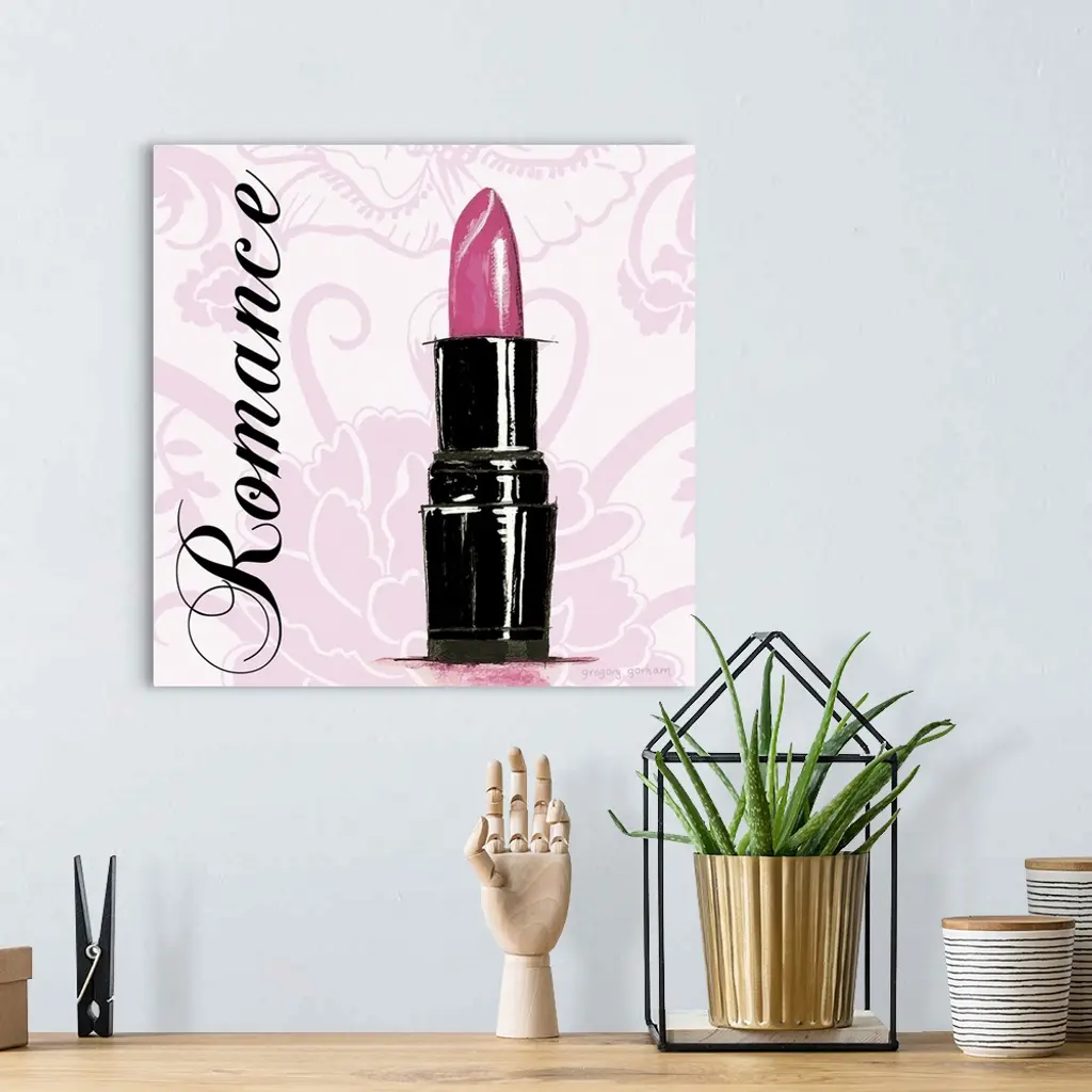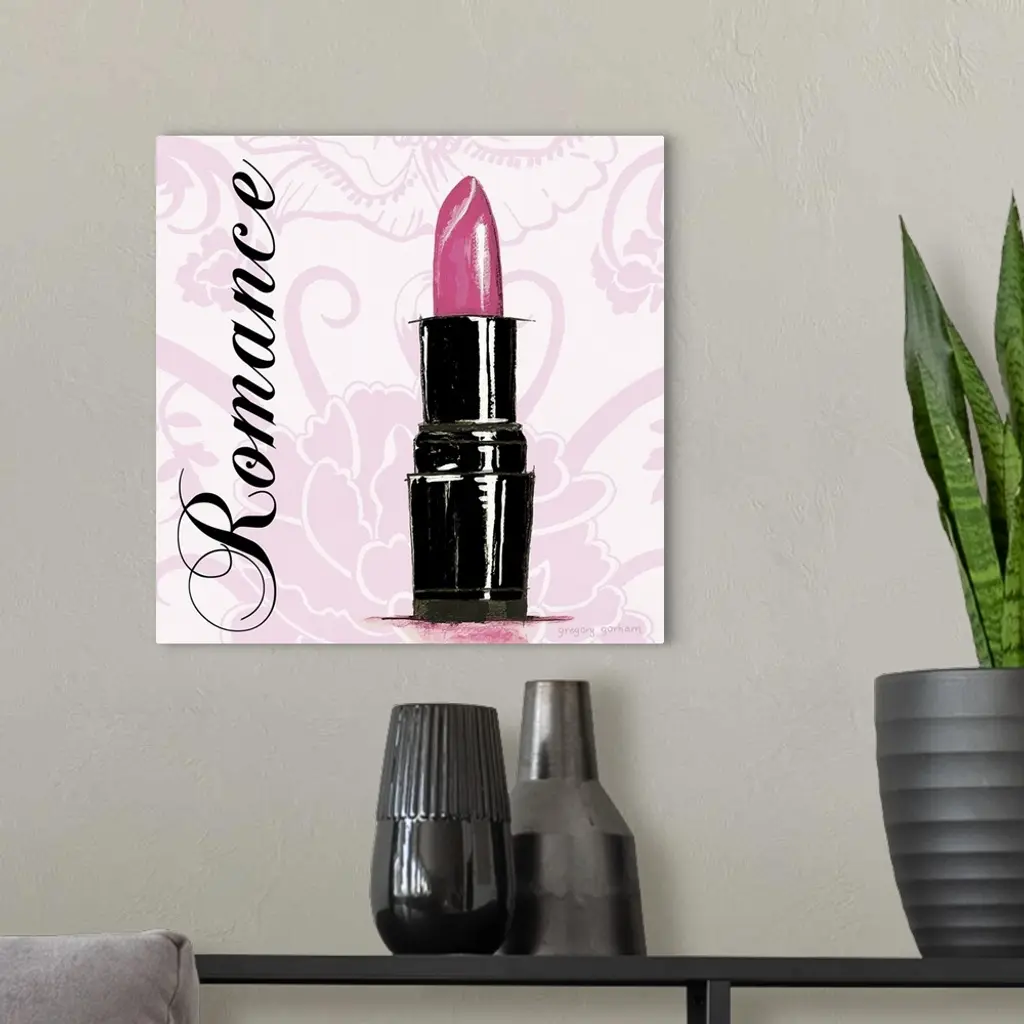 Decorative square art with a pink floral background and an illustration of a tube of lipstick with the word "Romance" written on the side in black.