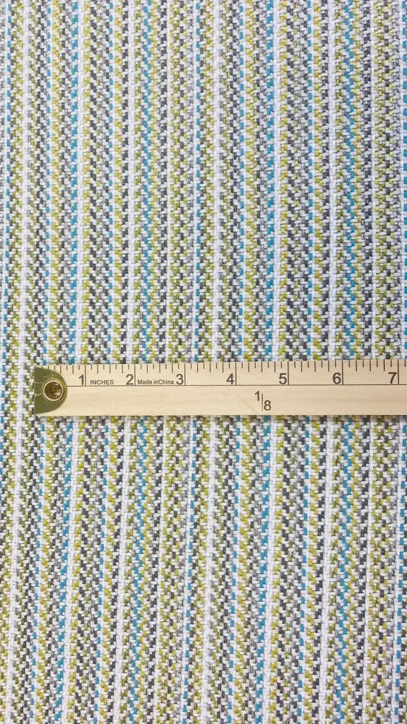 56" wide Romo Esker Wasabi indoor outdoor chartreuse green grey turquoise blue white woven upholstery fabric. Price is per yard. Designer:Romo Collection:Mokolo Outdoor Product code:7886/03 Colour:Wasabi Type:Outdoor Weave Width:139cm Pattern type:Straight match patterned Pattern repeat:20cm Composition:100% Polypropylene End use:Outdoor Cushions & UpholsteryRub test:40,000