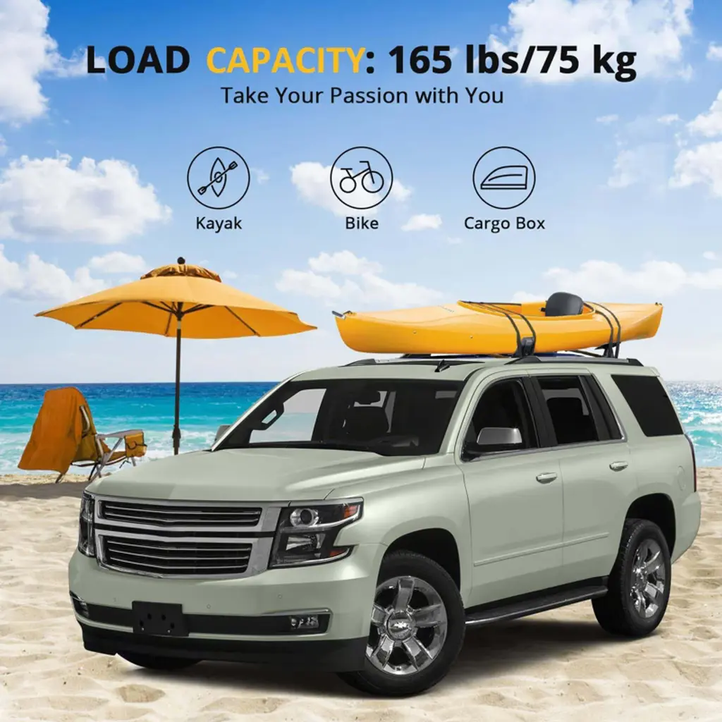 1.Precise Fit for 2015-2020 Chevy Suburban & Tahoe These roof rack cross bars are engineered specifically for 2015-2020 Chevrolet Suburban and Tahoe models, ensuring a seamless, factory-like fit. Designed to align perfectly with the vehicles¡¯ original roof rails, they mount securely without modifications, creating a stable base for all rooftop gear¡ªno ill-fitting parts or guesswork. 2.Multi-Functional for All Rooftop Accessories Built to work with a wide range of rooftop equipment, these cross bars are compatible with cargo carriers, bike racks, ski/snowboard holders, roof boxes, roof bags, kayak racks, and canoe racks. Whether transporting outdoor gear, extra luggage, or sports equipment, they provide a reliable platform to expand your Suburban or Tahoe¡¯s storage capabilities. 3.165 lbs Load Capacity for Heavy-Duty Hauling With a robust 165 lbs load capacity, these cross bars enhance your vehicle¡¯s carrying power, making it easy to transport large or bulky items. From camping tents and family luggage to kayaks and bicycles, they handle heavy loads securely, ensuring a stable and safe journey¡ªideal for family road trips, camping adventures, or long-distance travel. 4.Expand Storage for Every Journey Perfect for maximizing interior space, these cross bars free up cabin room by carrying items on the roof. Whether heading on a vacation, skiing trip, or camping excursion, they let you bring more gear without cramming the interior¡ªmaking long drives more comfortable and organized for passengers. 5.12-Month Warranty for Peace of Mind Backed by a 12-month warranty, these cross bars come with reliable after-sales support. If you have any questions or concerns about fit, installation, or performance, our team is ready to assist, ensuring you feel confident in your purchase for all your rooftop hauling needs.