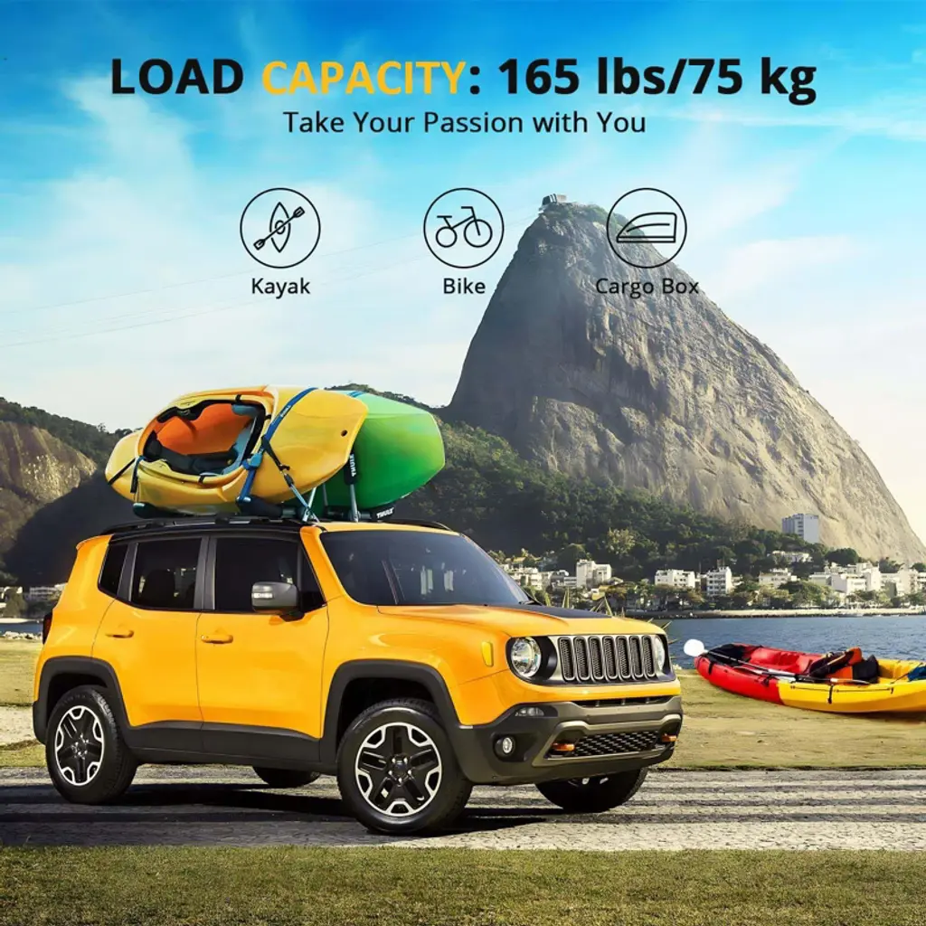 1.Perfect Fit for 2015-2022 Jeep RenegadeThese roof rack cross bars are specifically designed to fit 2015-2022 Jeep Renegade models, ensuring a seamless, secure installation that aligns with your vehicle¡¯s roof rails. The precise fit guarantees stability during travel, whether you¡¯re heading out for a road trip or daily commutes.2.Multi-Functional Design for Versatile GearIdeal for a wide range of outdoor and travel needs, these cross bars work with various accessories: cargo carriers, bike racks, ski holders, roof boxes, roof bags, kayak racks, and canoe racks. This versatility lets you transport different gear without needing multiple setups, adapting to your changing adventures.3.165 lbs Load Capacity for Heavy ItemsWith a robust 165 lbs weight capacity, these cross bars enhance your Jeep¡¯s carrying capabilities, making it easy to transport large or bulky items. From heavy luggage to outdoor equipment, they provide reliable support, ensuring a smoother, more enjoyable journey with all your essentials on board.4.Widely Useful for Outdoor ActivitiesWhether you¡¯re going on a long-distance road trip, camping, hiking, or snowboarding, these roof bars add valuable storage space to your vehicle. They easily carry luggage, tents, kayaks, bicycles, snowboards, and more, freeing up space inside your Jeep and making outdoor adventures more convenient.5.12-Month Warranty for Peace of MindBacked by a 12-month warranty, these cross bars come with reliable after-sales support. If you have any concerns or questions about installation, performance, or fit, our team is ready to assist, ensuring you feel confident in your purchase for years to come.